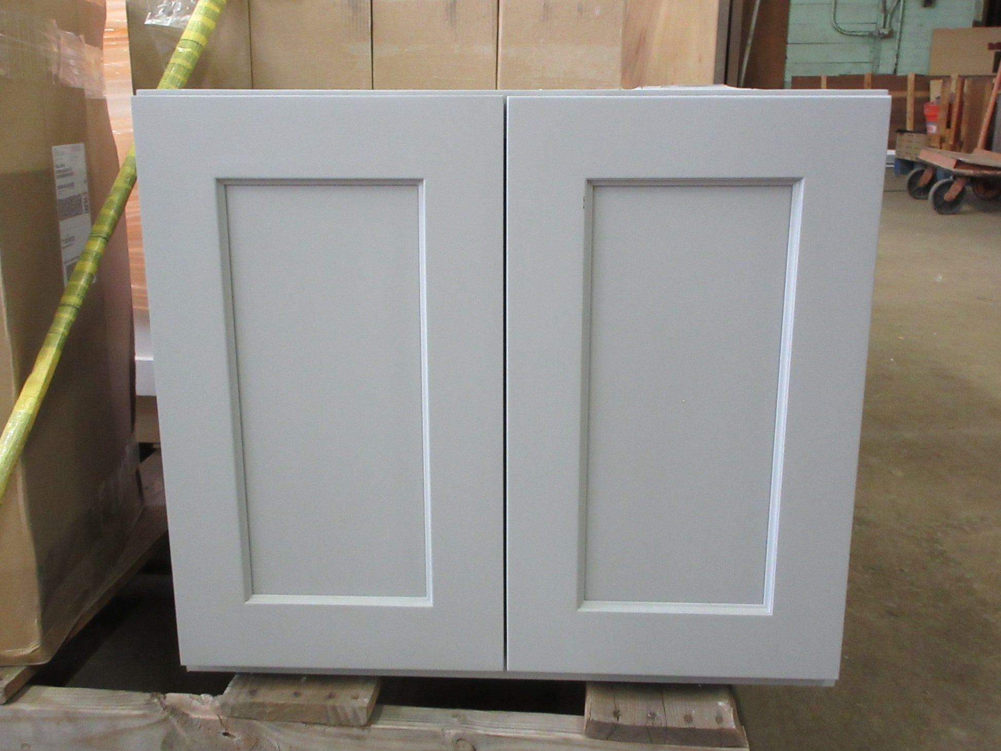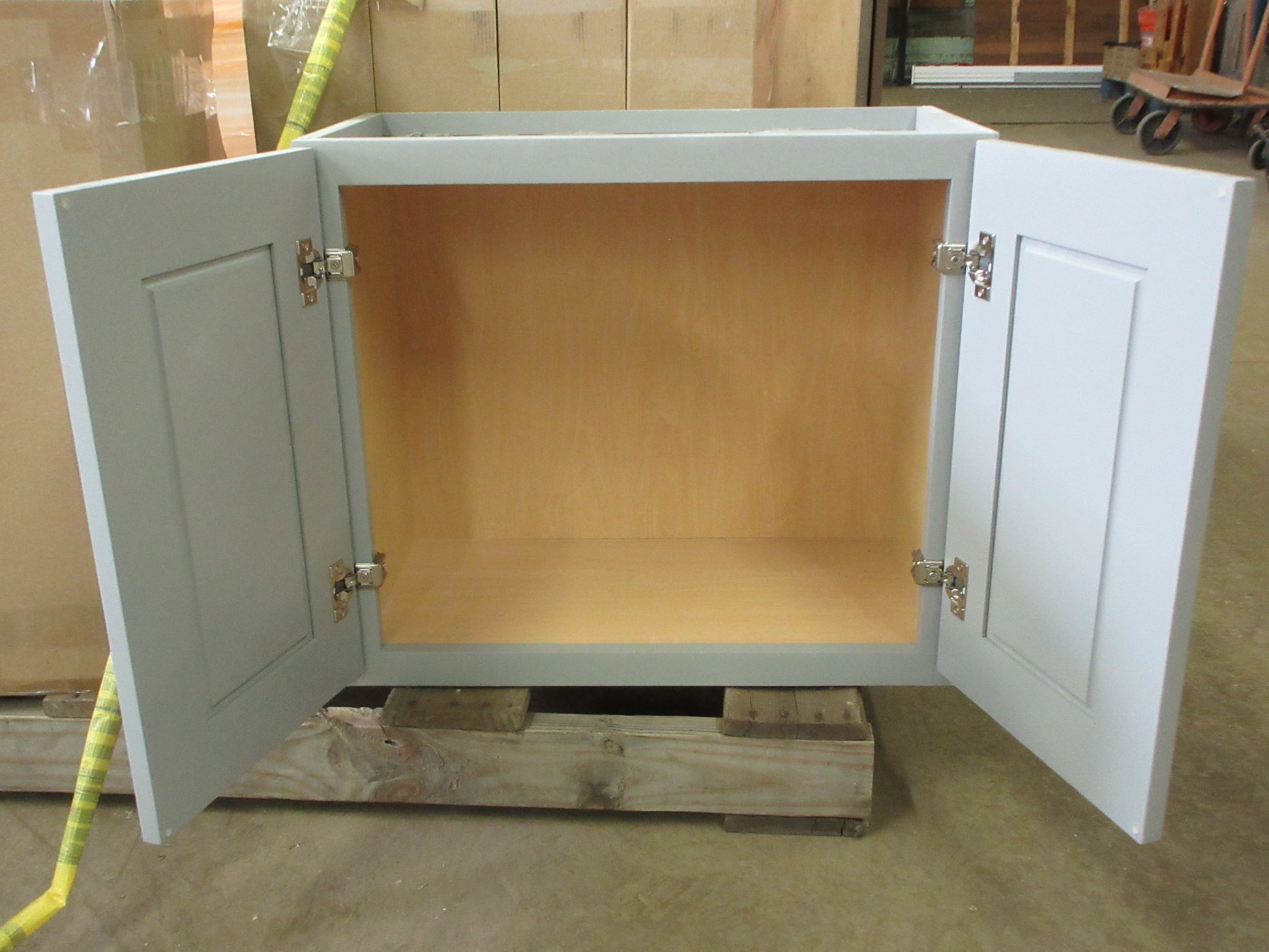 Description : Wall mount cabinet with two doors and grey finish.