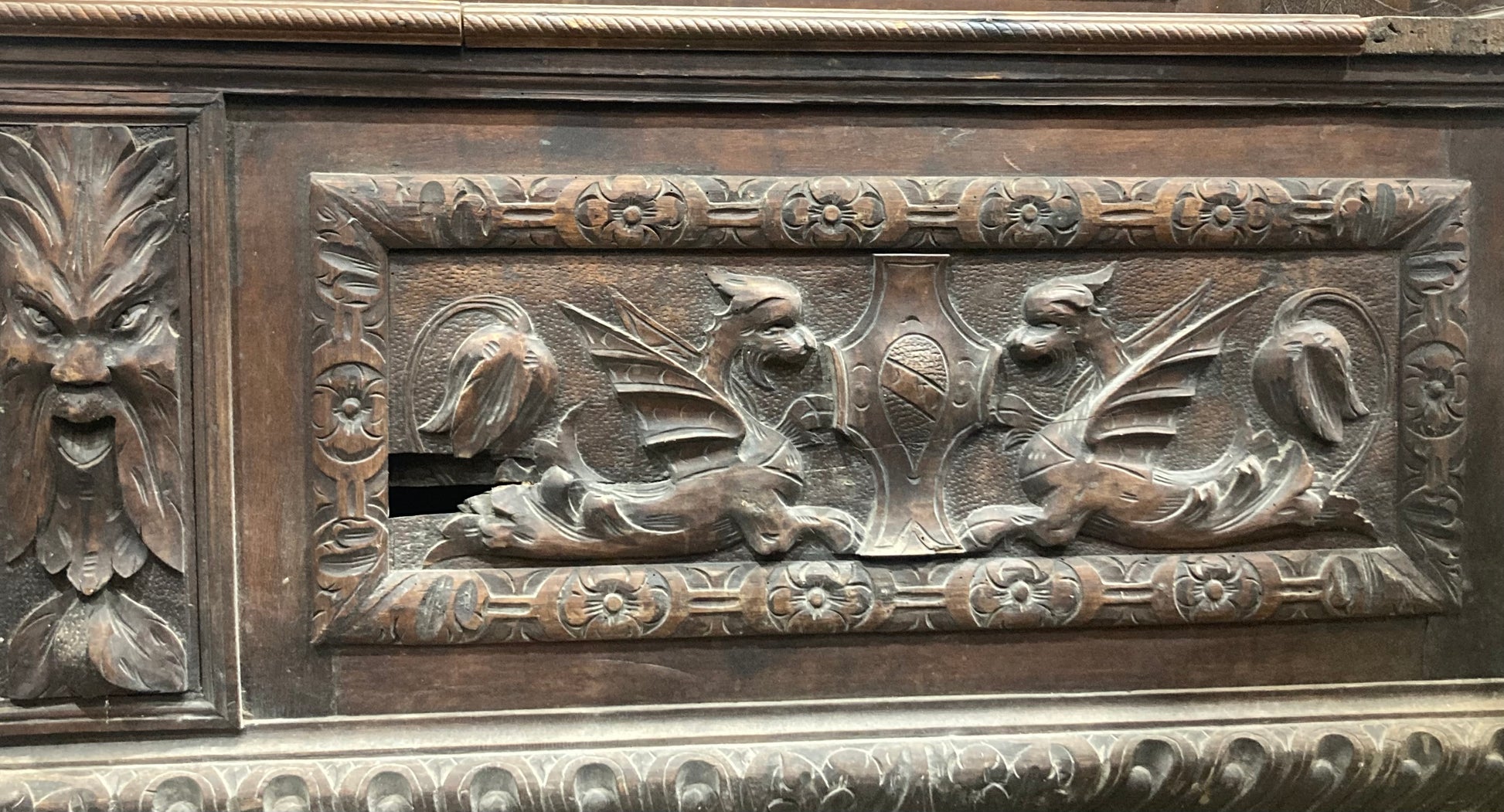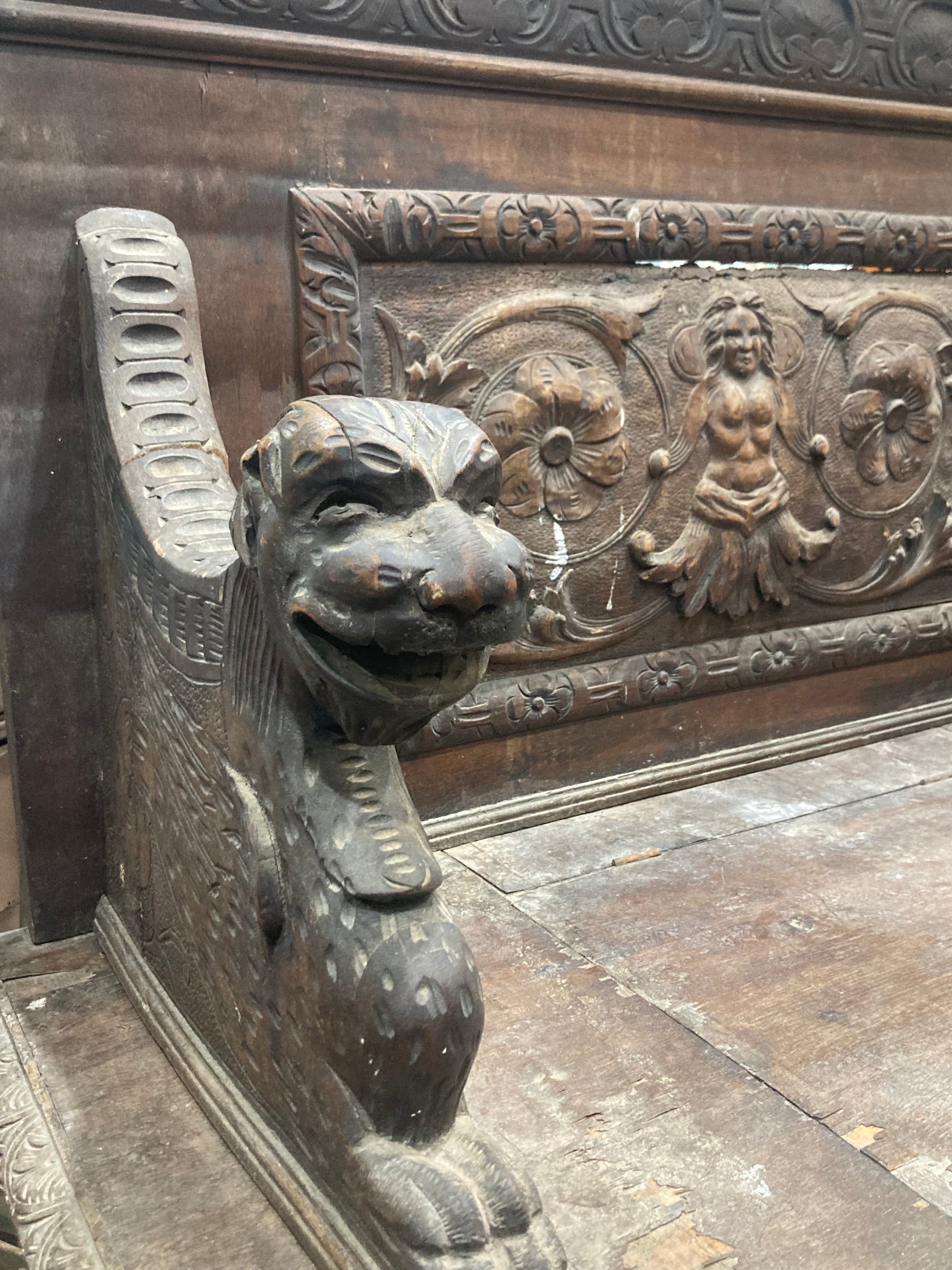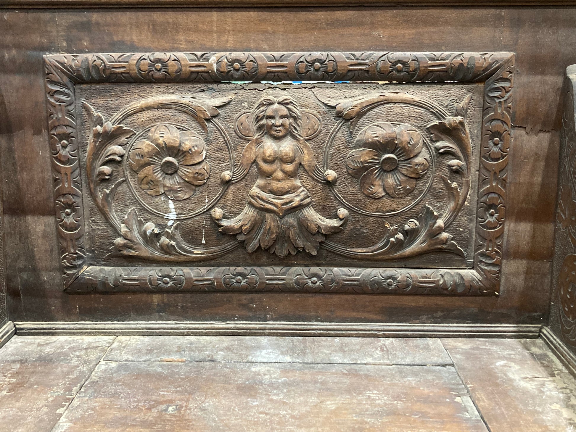 Description : Hand-carved wooden hall bench with relief sculptures of mythological and grotesque figures, floral motifs, and decorative panels. It includes a hinged seat that reveals a spacious storage compartment.