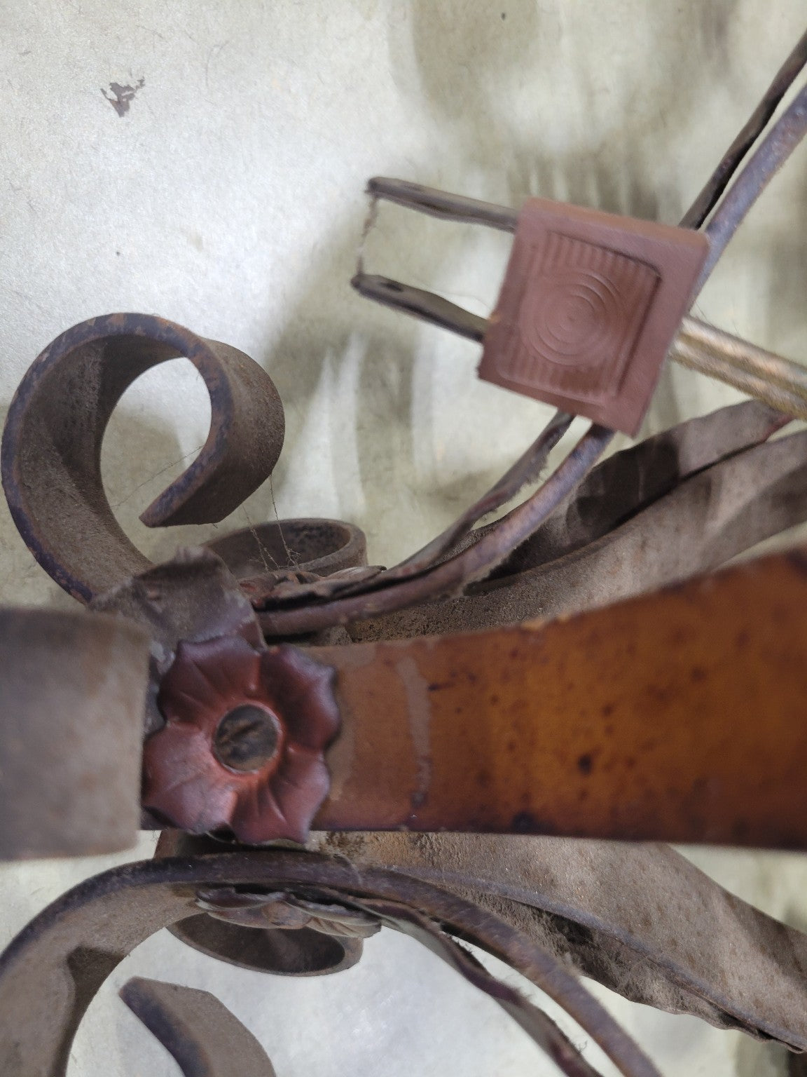 Hand-forged iron with riveted joints, scrollwork, and floral stamp appliqués
