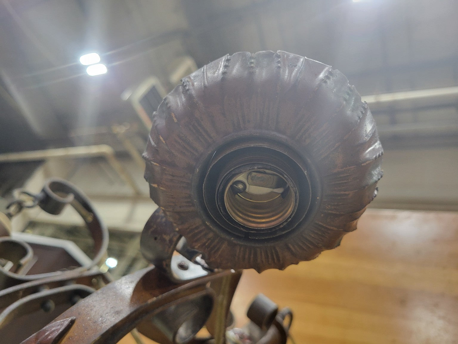 This wrought iron chandelier is a dramatic example of Spanish Revival craftsmanship, featuring hammered scroll arms, leaf embellishments, and floral rosettes in a warm, rusted finish. With five bulb holders suspended from decorative hooks and hand-curled detailing throughout, this fixture makes a strong architectural statement. It appears to retain its original plug wiring, though rewiring is necessary for modern use. The chandelier’s aged patina and robust form are ideal for rustic, Mediterranean, or gothic-inspired spaces.