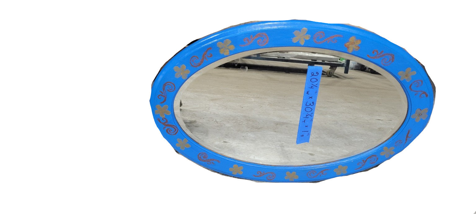 A striking hand-painted oval mirror with a bright blue wooden frame, adorned with gold floral motifs and swirling accents. The mirror’s folk-art aesthetic adds a bold and artistic flair, making it a perfect statement piece for eclectic, bohemian, or vintage-inspired interiors.