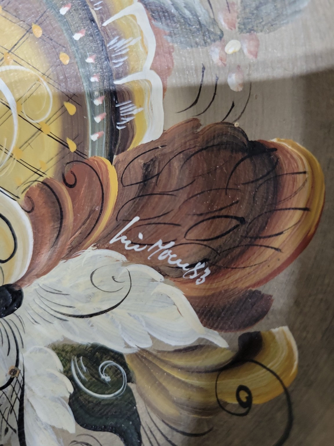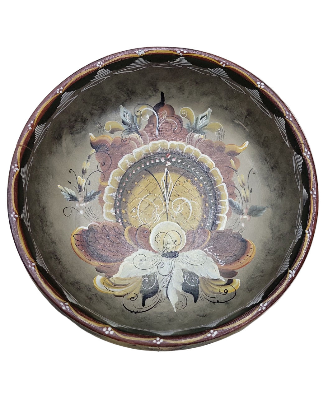 This 8 ¼" diameter by 3" tall wooden bowl features an exquisite hand-painted Rosemaling design—an iconic Norwegian folk art form characterized by flowing scrolls, floral motifs, and symmetrical patterns. The center medallion bursts with warm tones of ochre, burgundy, and cream, framed by dynamic brushstrokes and traditional dotwork. The artist’s signature, Lewis Moucks, is elegantly inscribed on the interior floral flourish. This piece embodies both cultural heritage and artistic craftsmanship, making it a standout for folk art collectors or lovers of Scandinavian décor.