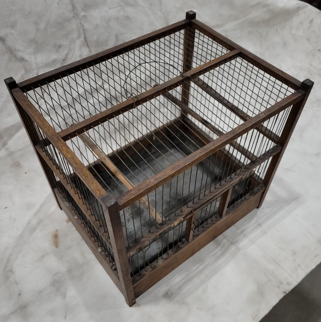This vintage bird cage is handcrafted from solid wood and wire, featuring vertical iron bars and a hinged front door. The structure includes two natural wooden perches and a removable metal tray base, likely galvanized, for ease of cleaning. Its compact and functional design shows clear signs of hand assembly, with a slightly uneven patina that adds to its authentic rustic appeal. The cage offers character-rich charm for collectors, rustic décor lovers, or creative reuse as a display or lighting element.