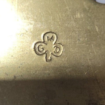 Description : Stamped “GMD” inside a shamrock (likely General Manufacturing & Design, a known U.S. hardware maker), this is a solid metal mortise hinge with removable pin and classic decorative finials. Sized at 4½" x 2½" x ¼", it is a substantial hinge made for interior or light exterior doors.