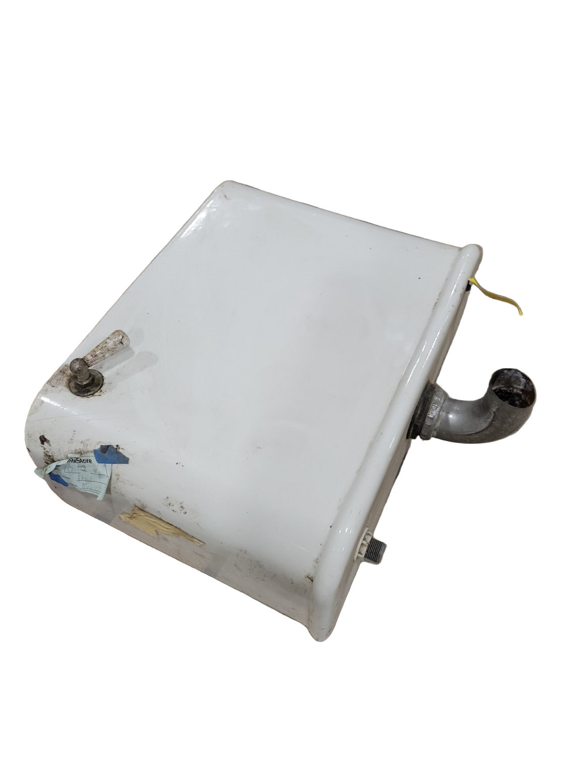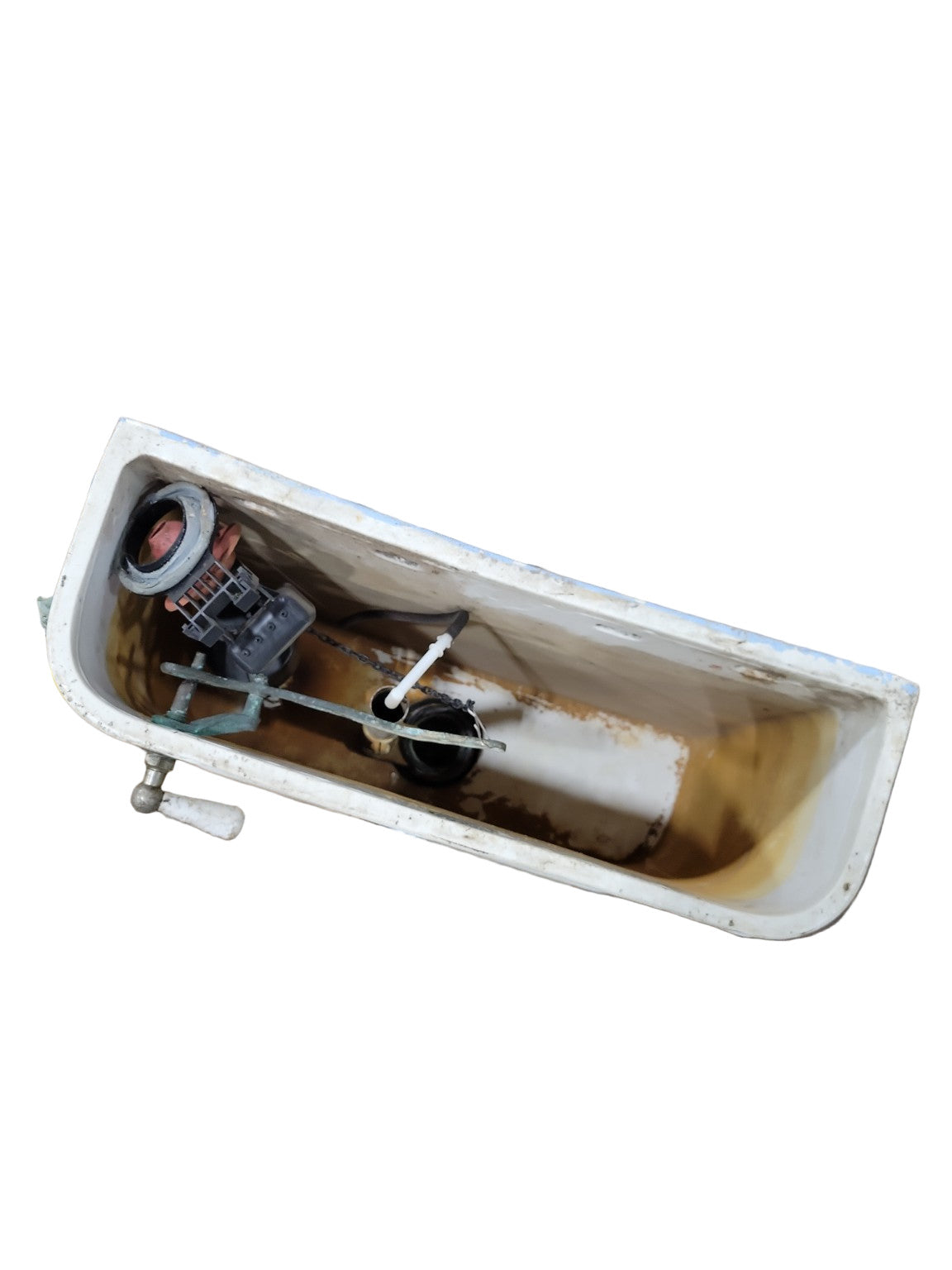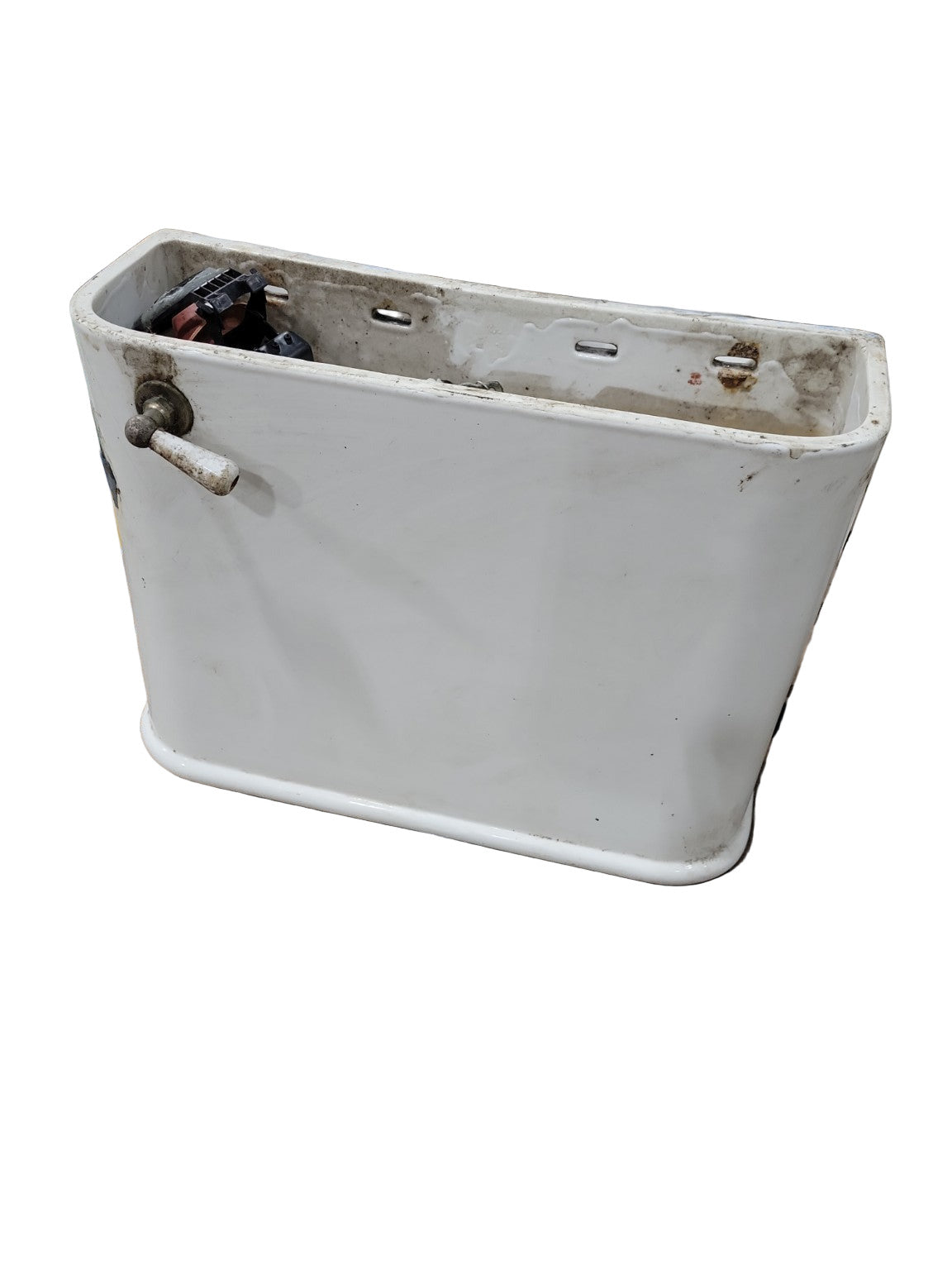 The piece includes original fittings—flush lever, inlet valve, and overflow hardware—with interior mineral deposits and natural patina consistent with age. Structurally intact and free of major cracks, this tank is ideal for historical restoration, architectural salvage, or display.