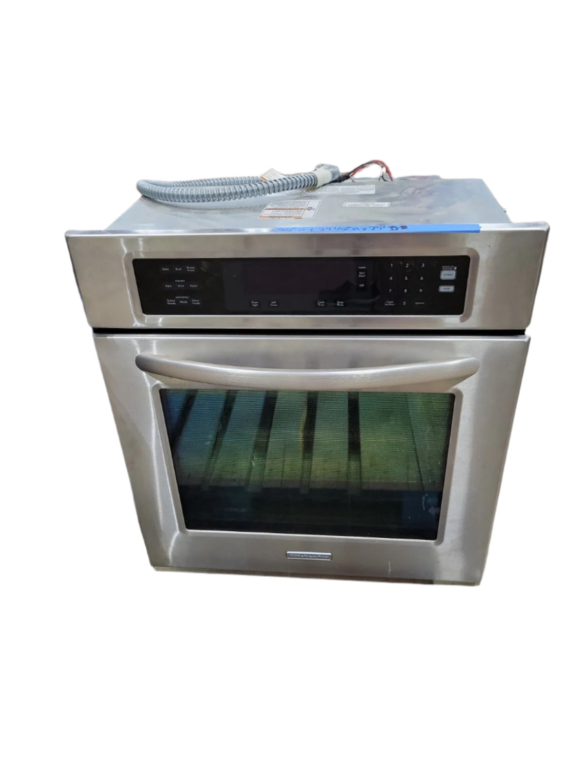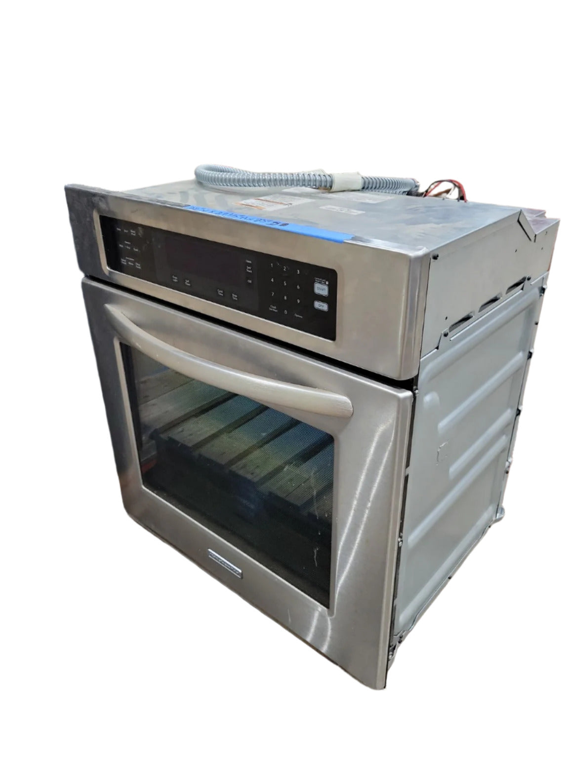 A built-in KitchenAid stainless steel electric wall oven with digital touchpad controls and a large front-view glass window. This model offers a range of functions including bake, broil, roast, bread proofing, convection bake, and self-clean. Designed for seamless integration into cabinetry, it brings a professional and modern look to any kitchen. The stainless steel finish and spacious oven cavity make it suitable for both everyday cooking and entertaining. This unit shows some cosmetic wear from prior installation but remains a high-quality, fully functional appliance ideal for reuse or refurbishment.
