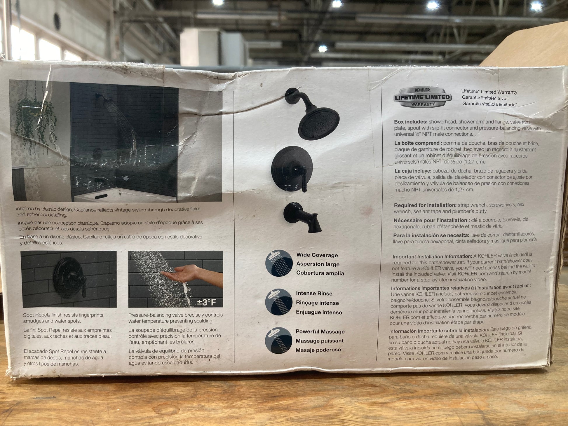 Kohler Capilano Matte Black Bath Faucet and Turn knob Set. Everything but the shower head is included and in its original packaging.