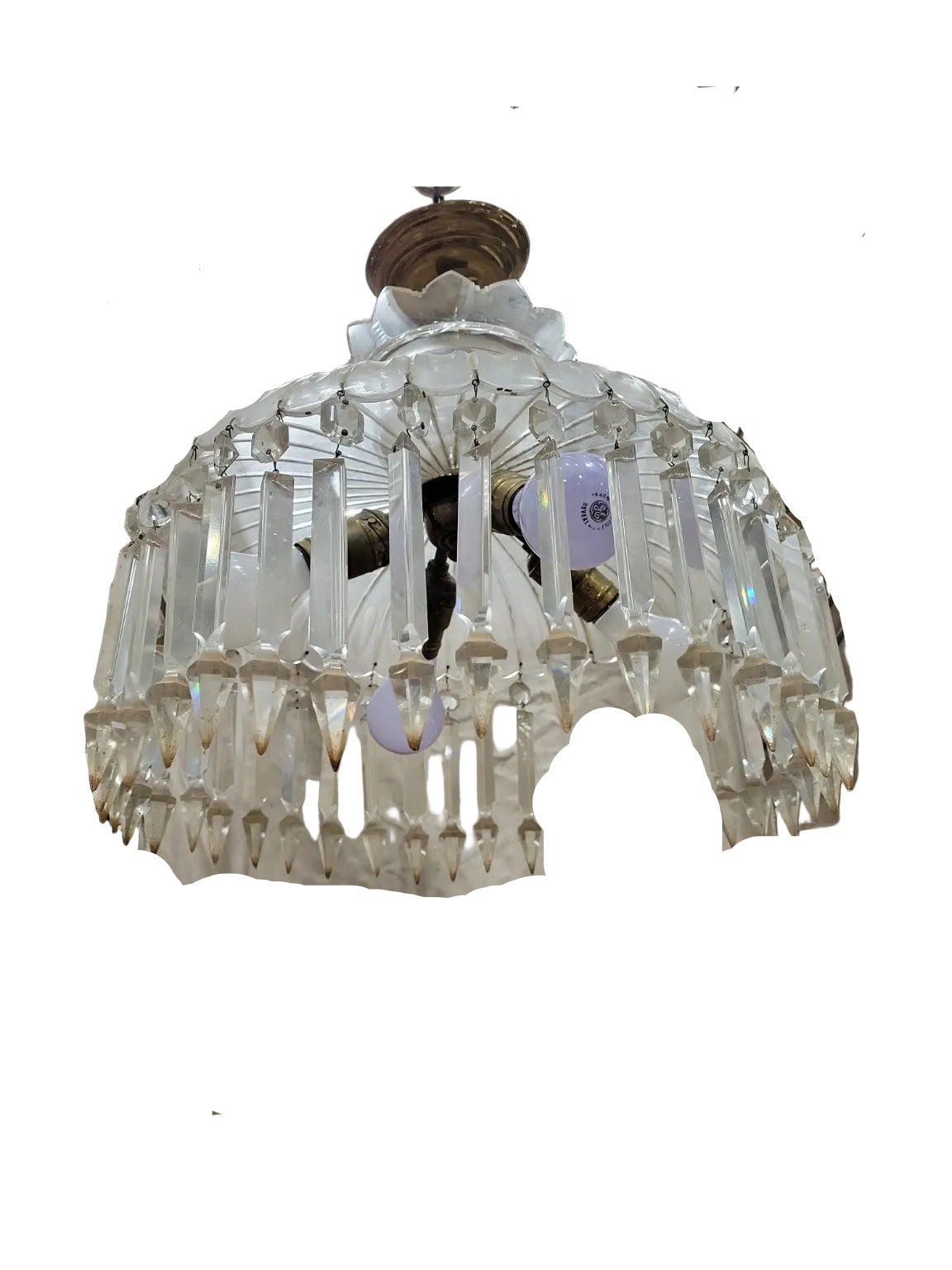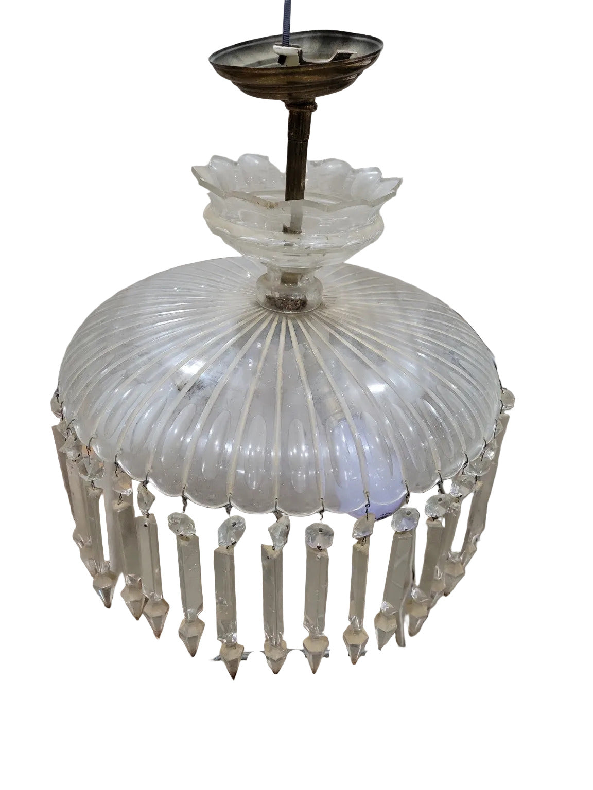 Description : This generously sized antique chandelier features a wide, ribbed glass dome accented by a decorative glass collar and suspended from a brass canopy. It is adorned with dual-cut glass prisms—octagonal connectors and elongated pointed drops—that would fully encircle the base when complete. While four crystal prisms are missing, the fixture retains a striking, symmetrical presence. The aged patina and multi-socket interior hint at its original grandeur, making it a strong candidate for both restoration or vintage display. It would suit entryways, stairwells, or dining areas looking to capture early 20th-century charm.