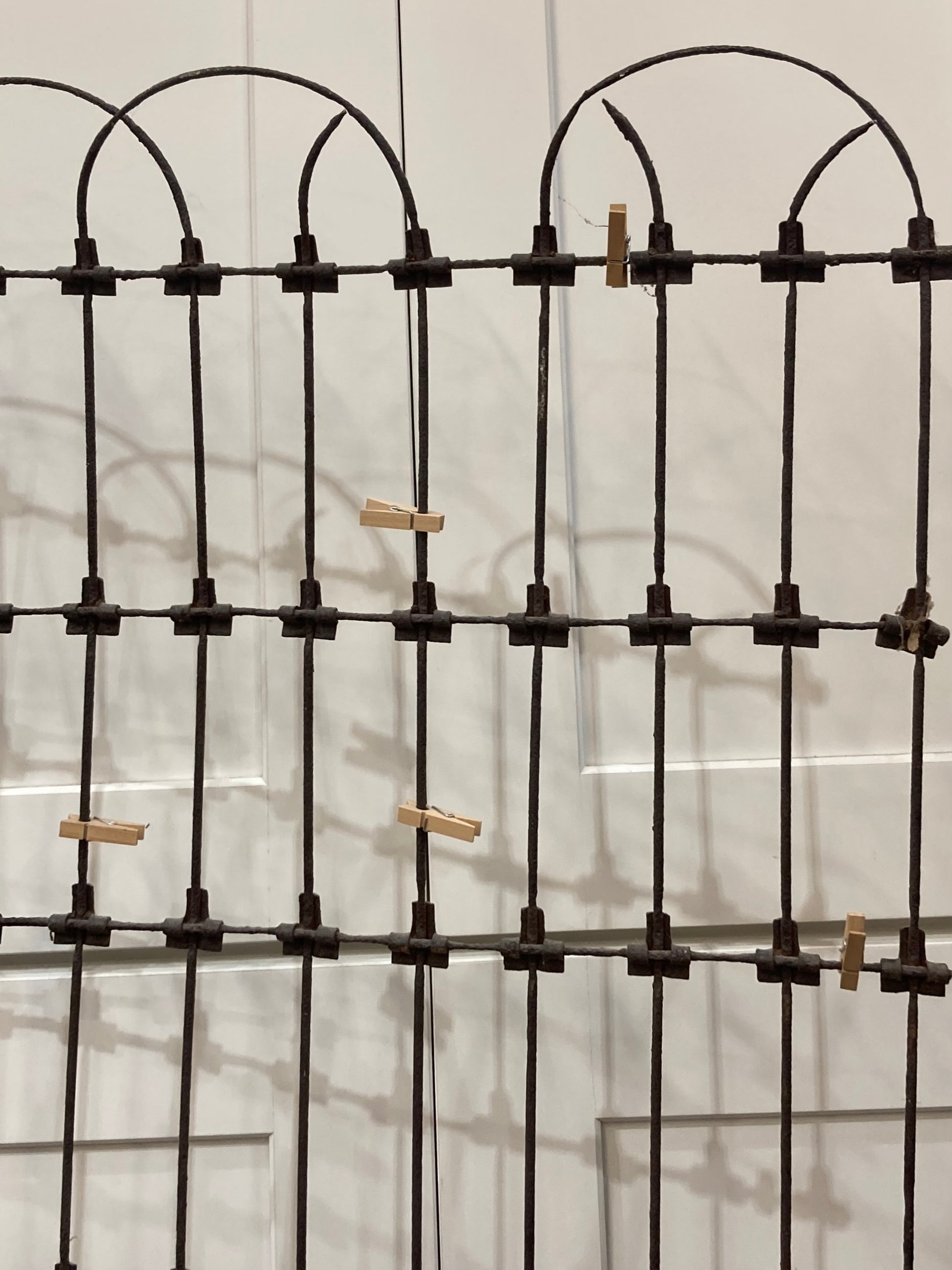 Description : This metal display rack could be used to hold photos, trellis plants, or as a unique way to hold tools.