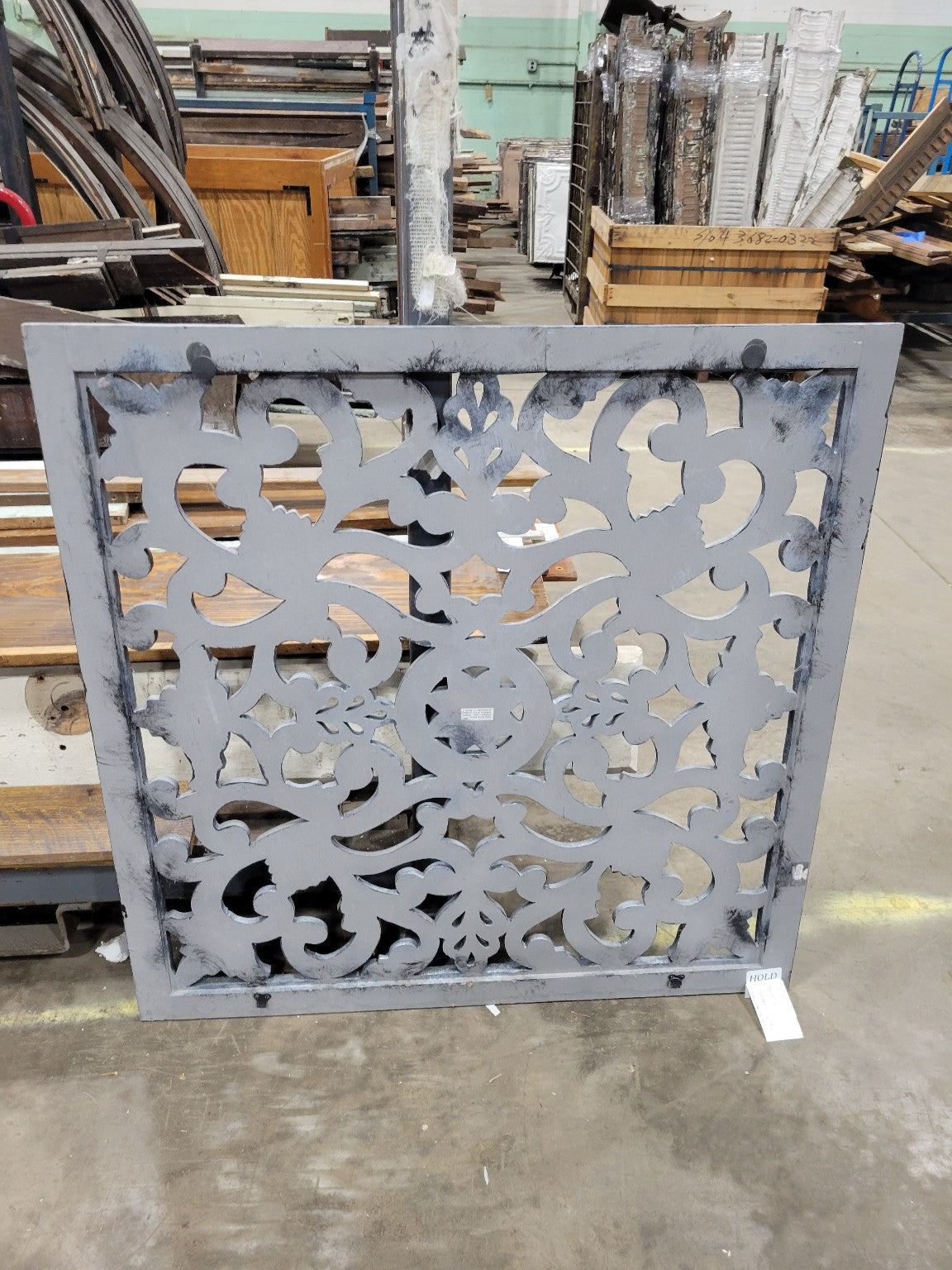 This large vintage carved wood panel showcases an elaborate scroll and floral motif, centered by a decorative medallion. Measuring 36" square and ¾" thick, the panel features a hand-painted gray finish with subtle distressed highlights, adding character and vintage appeal. Originally intended for decorative architectural applications, it is ideal as a dramatic wall accent, headboard insert, or a unique garden feature. Visible natural imperfections and age marks enhance its rustic authenticity.