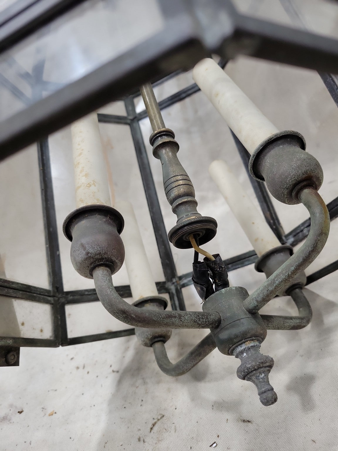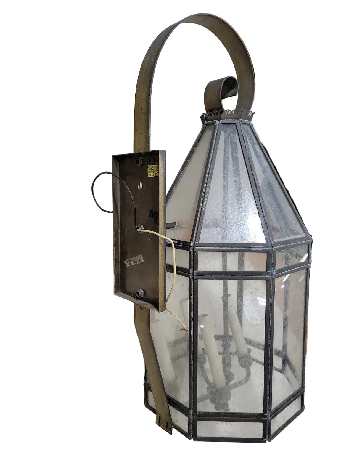 This substantial outdoor wall lantern is crafted from wrought iron with beveled clear glass panes and an elegant, tapered octagonal form. Its architectural shape and curled bracket mount evoke a Gothic Revival style, further emphasized by the crown-like detail along the lantern’s top. Inside, the light fixture mimics a traditional candelabra with five candle-style sockets (one missing its base), though the piece currently shows signs of aging and oxidation. Ideal for restoration projects, it brings authentic old-world charm to courtyards, entryways, or period-inspired renovations.