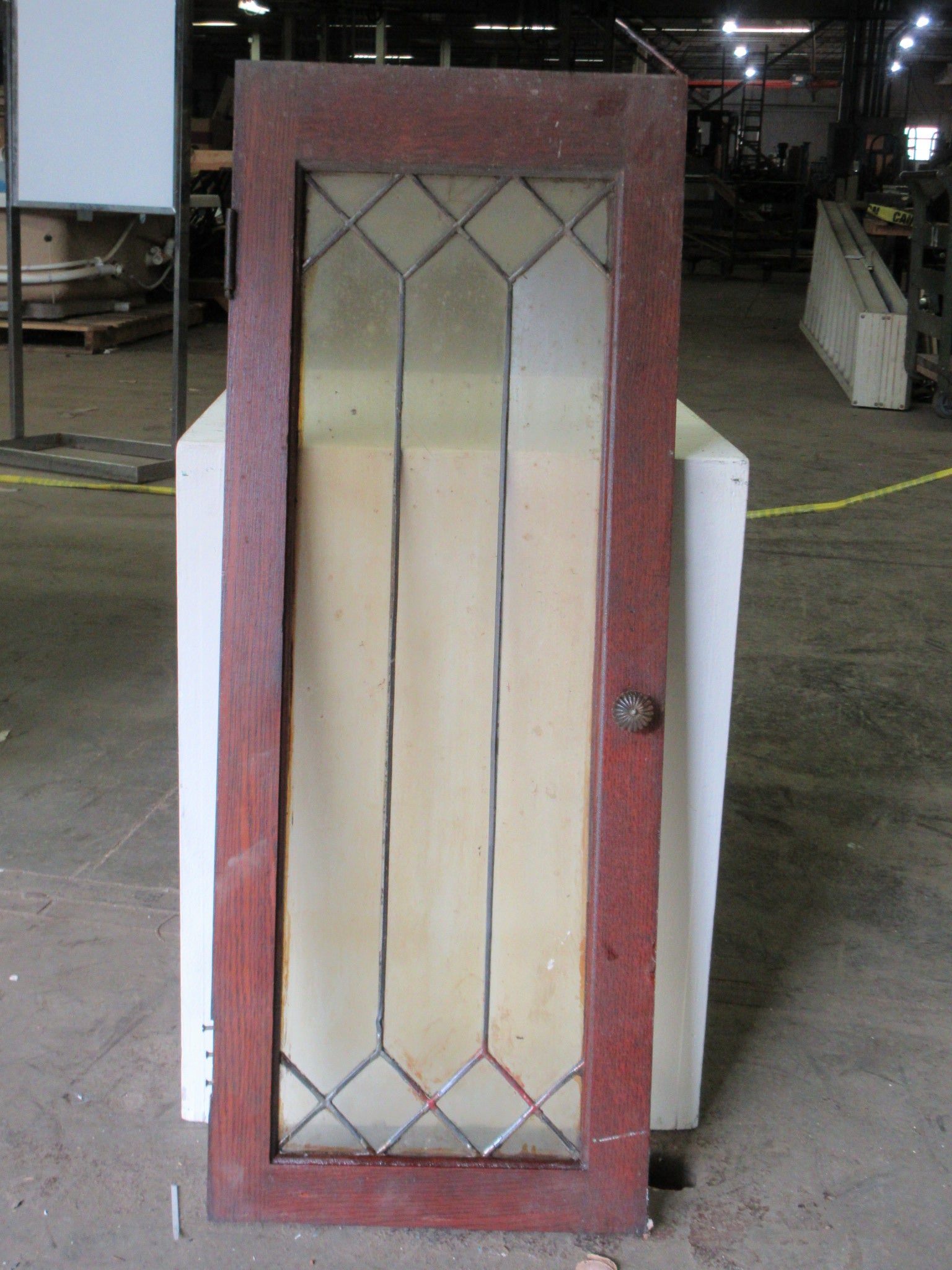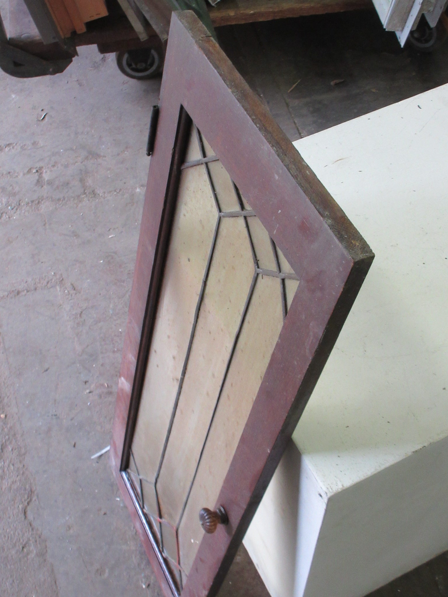 Description : Leaded glass cabinet door with glass knob and wood frame.