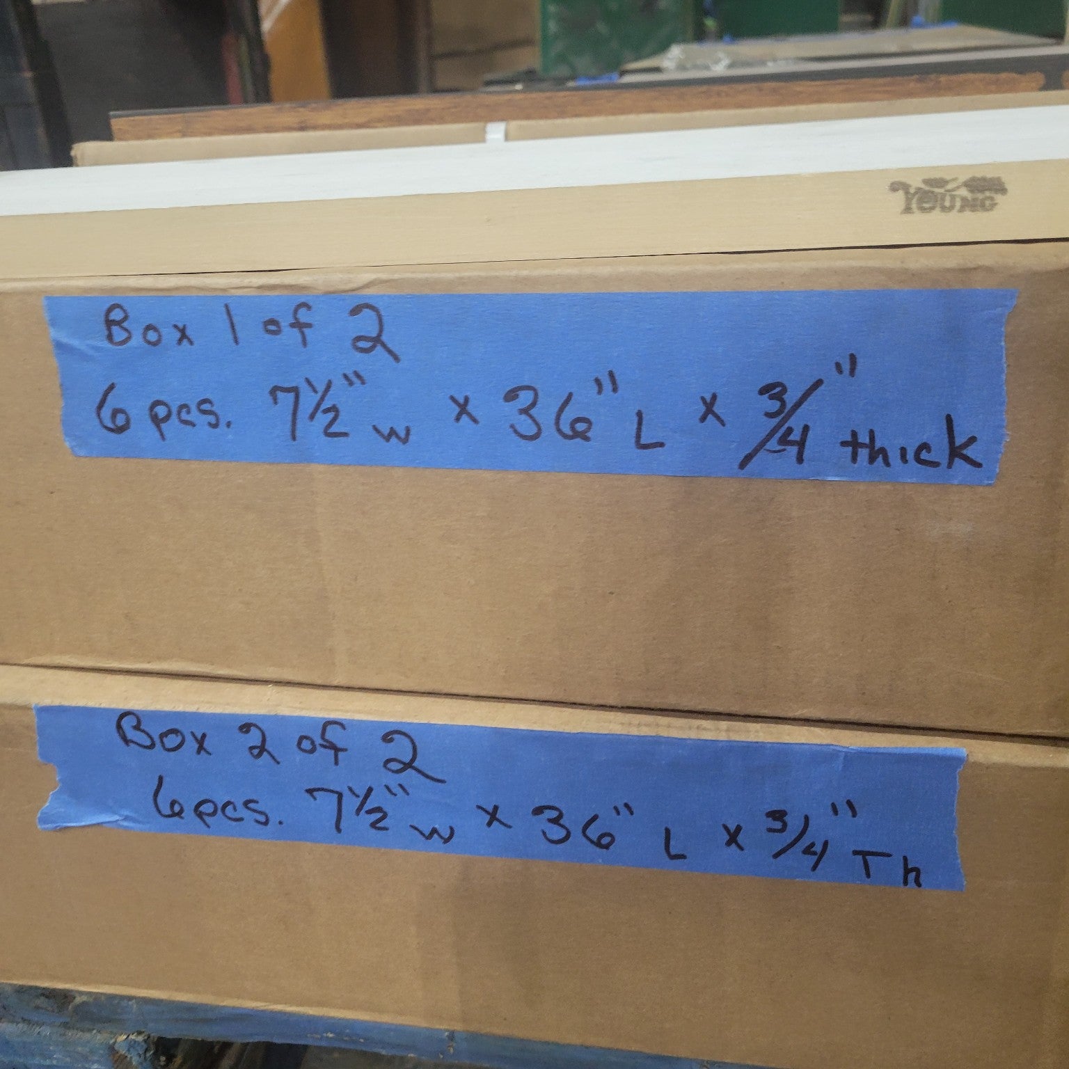 A set of 12 solid poplar primed stair risers, neatly packaged in two boxes (6 pieces per box). Each riser measures 36" L x 7 ½" W x ¾" T. These risers are factory-primed and ready for paint, making them ideal for stair projects, home renovations, or custom carpentry work.