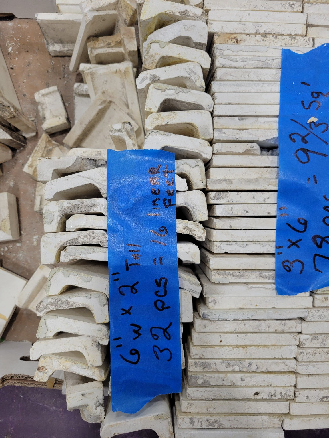 Description : Lot includes 32 salvaged bullnose edge tiles, each measuring 6" x 2". These tiles are ideal for finishing off backsplashes, showers, tub surrounds, or other trim applications. They cover approximately 16 linear feet. The pieces display some surface residue and chipping consistent with salvage but remain very usable for restoration or creative projects.