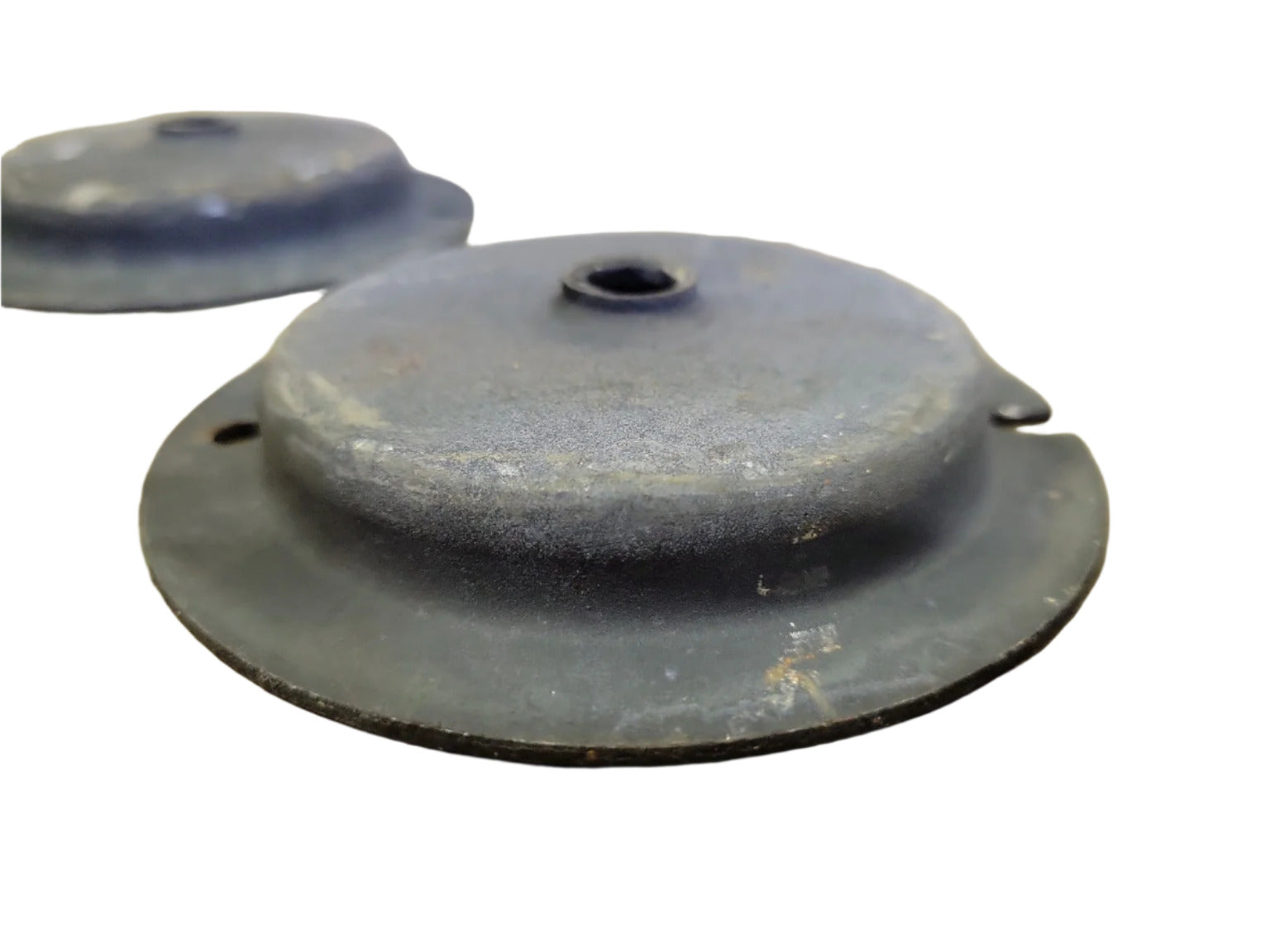This set of five vintage steel canopies, each measuring 4 1/16" in diameter, was originally used as ceiling or wall mount covers for small pendant lights or sconces. The slightly domed form features a central hole for fixture stems or downrods, along with additional notches and mounting holes for secure installation. Their aged, darkened patina speaks to years of service, making them ideal for authentic restorations, steampunk builds, or industrial-inspired custom lighting projects.
