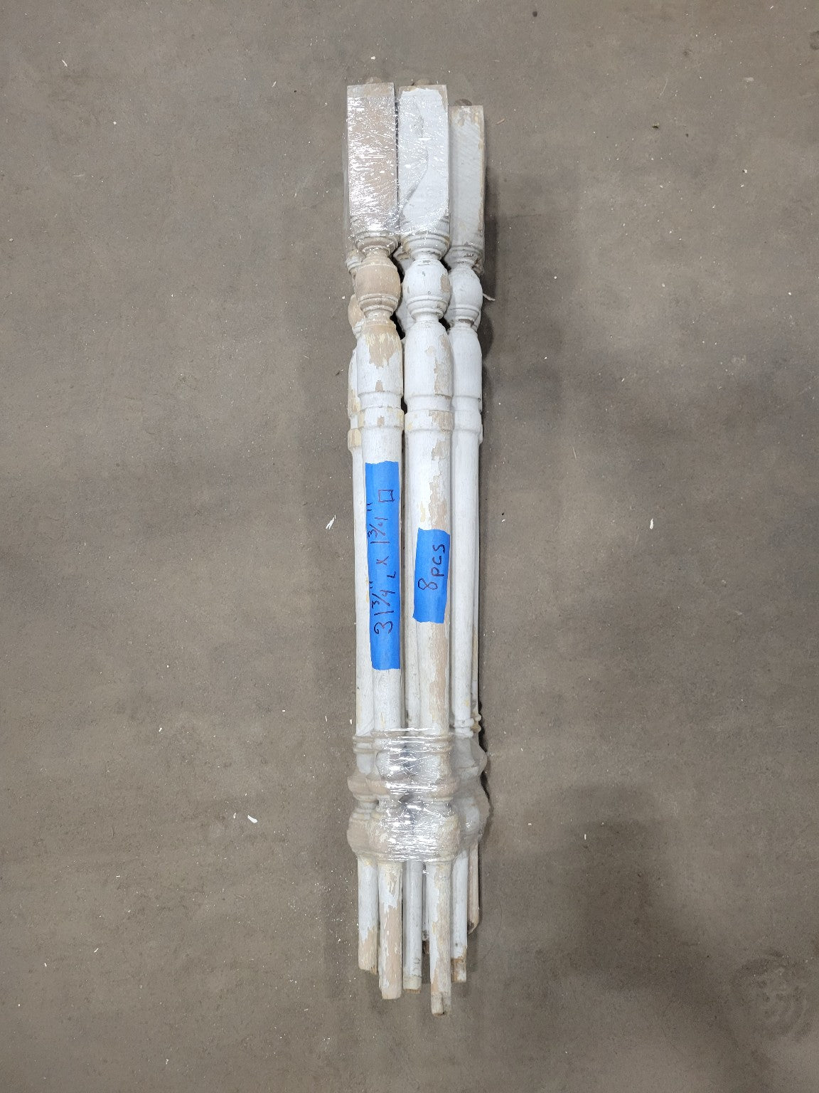 Description : This set features 8 salvaged turned wood stair balusters, finished in a distressed white paint. Each piece has a classic turned spindle design with detailed carvings, showing natural weathering and flaking from age and previous use. These balusters measure approximately 32 ¾" in length, perfect for stairway restoration, crafting farmhouse-style furniture, or architectural salvage projects. The visible aged patina adds unique character to each piece, ideal for those seeking authentic vintage materials.