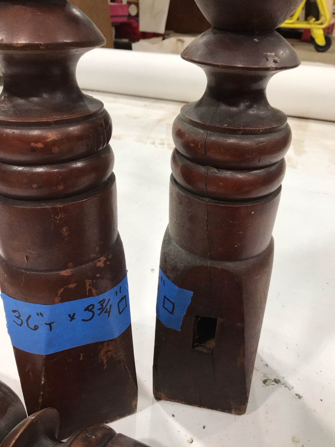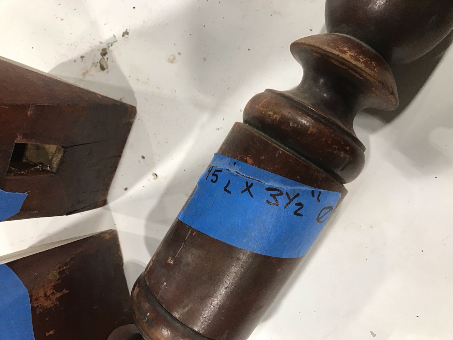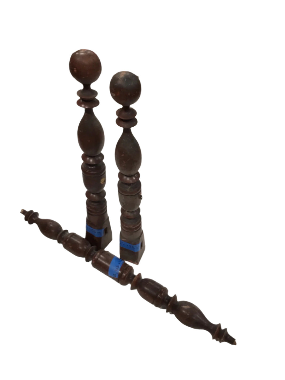 This lot includes several salvaged turned wood pieces, ideal for furniture restoration or creative upcycling projects. The set features intricate wood turnings, such as finials and spindles, with dimensions clearly marked for each piece. The pieces show patina and wear, reflecting their vintage character, and may require some light refinishing or repair.