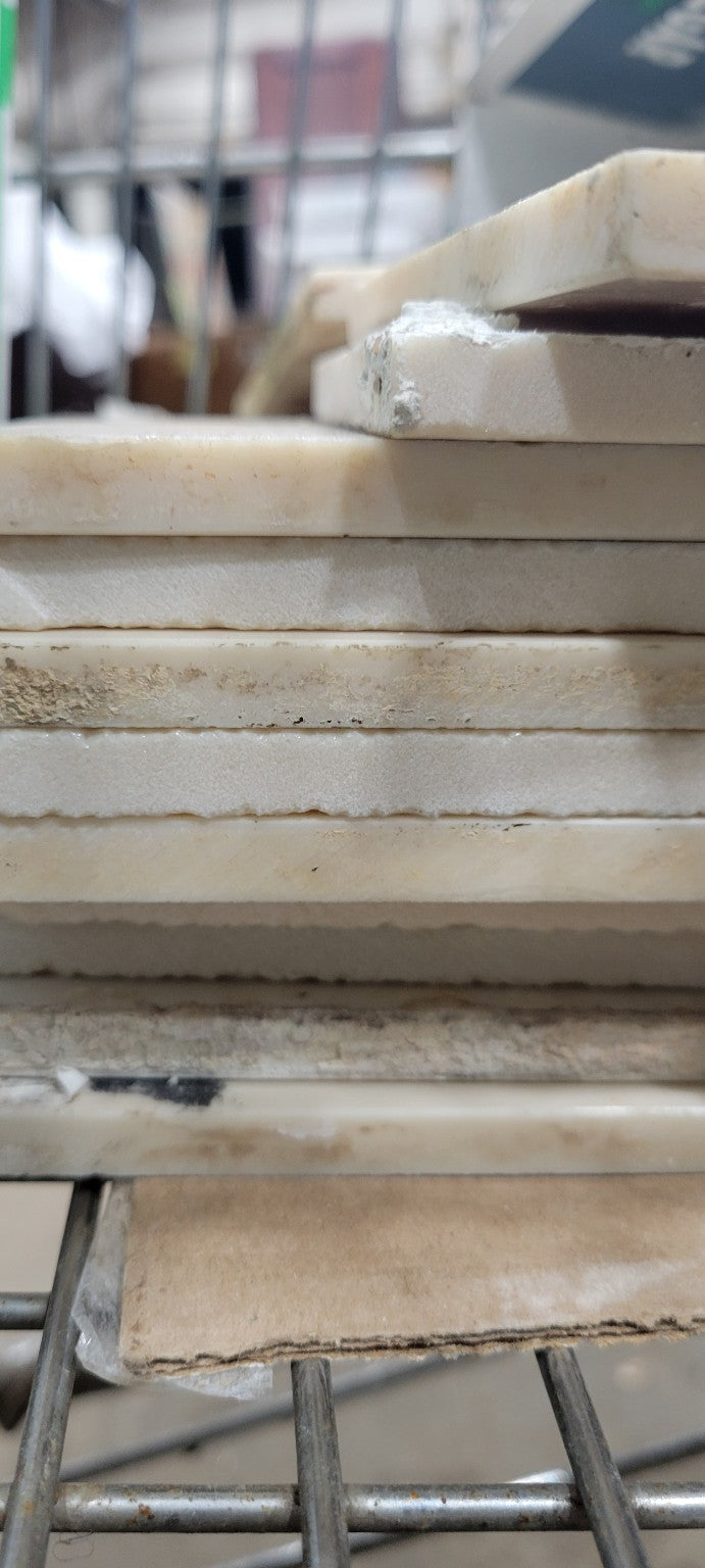 A collection of salvaged vitriloite panels in varying sizes, totaling approximately 10 square feet. These glossy, off-white panels were originally used for decorative wall and countertop applications, providing a smooth, durable surface with a classic mid-century aesthetic. Some pieces show minor chipping along the edges, making them ideal for restoration projects or creative repurposing.