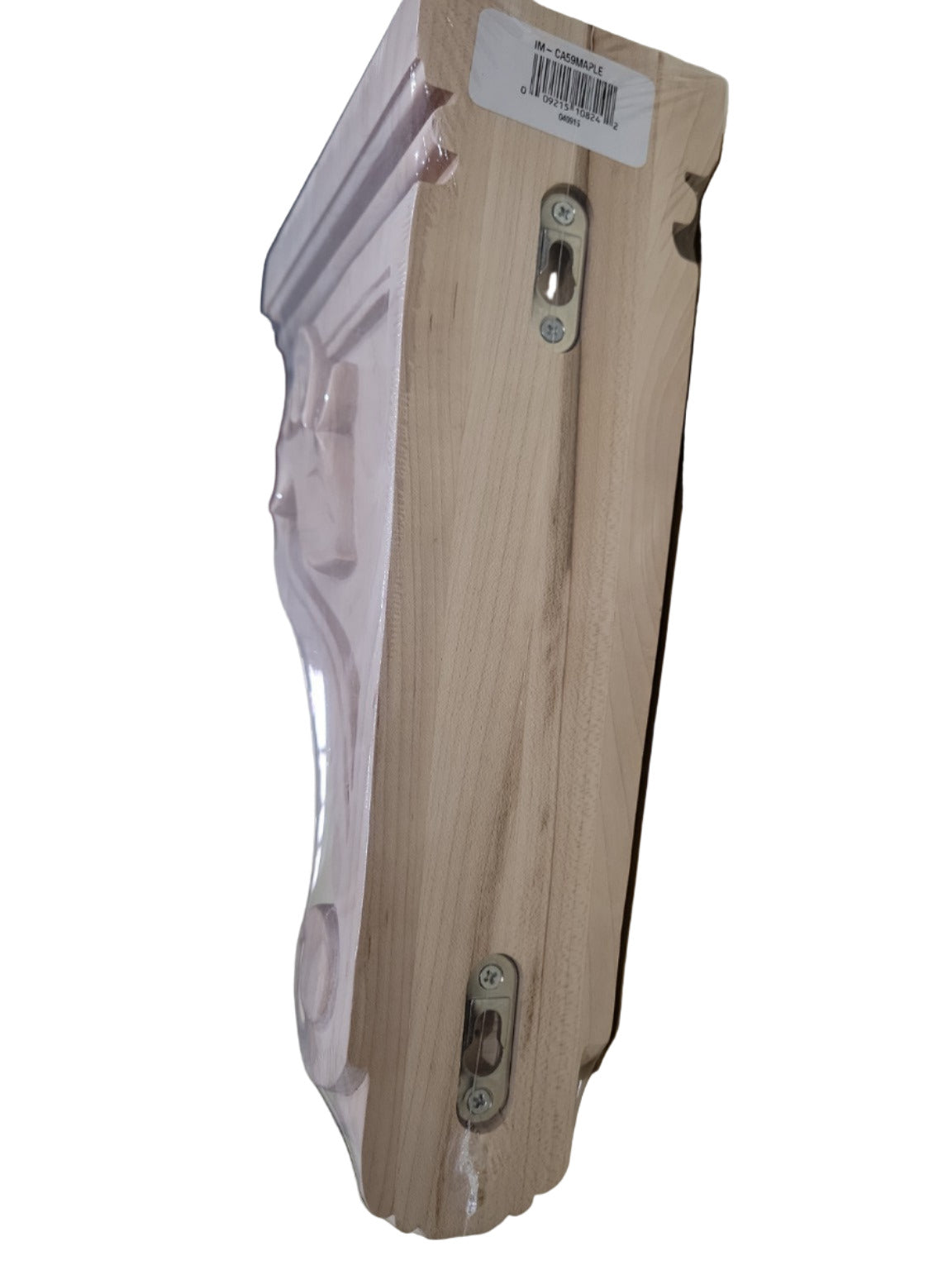 This substantial decorative corbel features a deeply carved maple leaf scroll design in high relief on a flat-backed triangular form. The piece is machine-carved from solid maple wood, unfinished and ready for paint or stain. Ideal for use beneath countertops, shelving, mantels, or custom cabinetry, this ornamental support piece blends strength with flourish. With keyhole mounting hardware pre-installed, it's easy to hang securely. Part of the Ornamental Products collection.