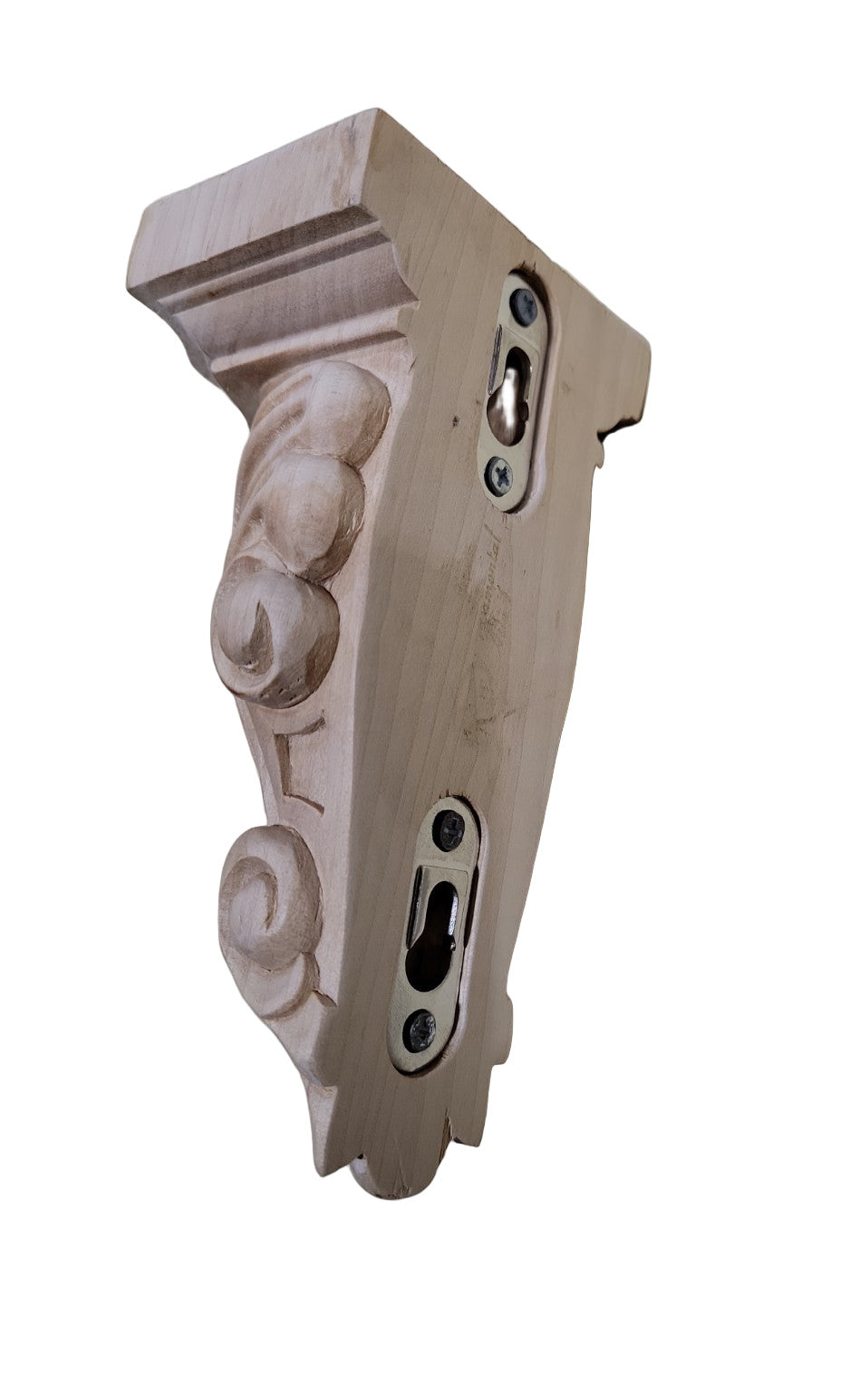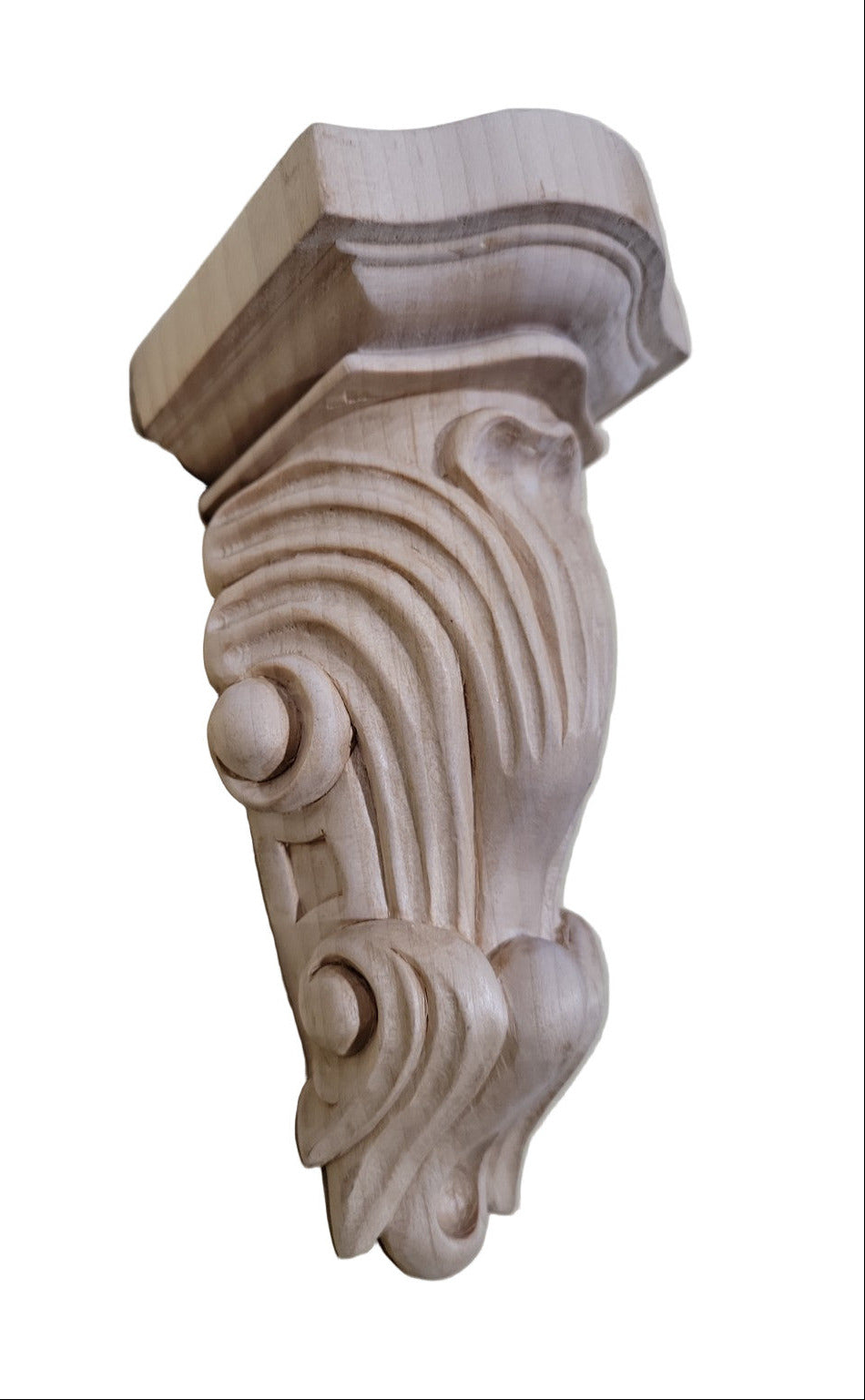 This decorative corbel from the Traditions collection by Ornamental Products offers classic acanthus and volute detailing in a compact footprint. Made from solid, unfinished maple, it's ideal for subtle architectural support under countertops, mantels, or shelving. The deep, symmetrical carving and keyhole mount hardware make it both elegant and easy to install.