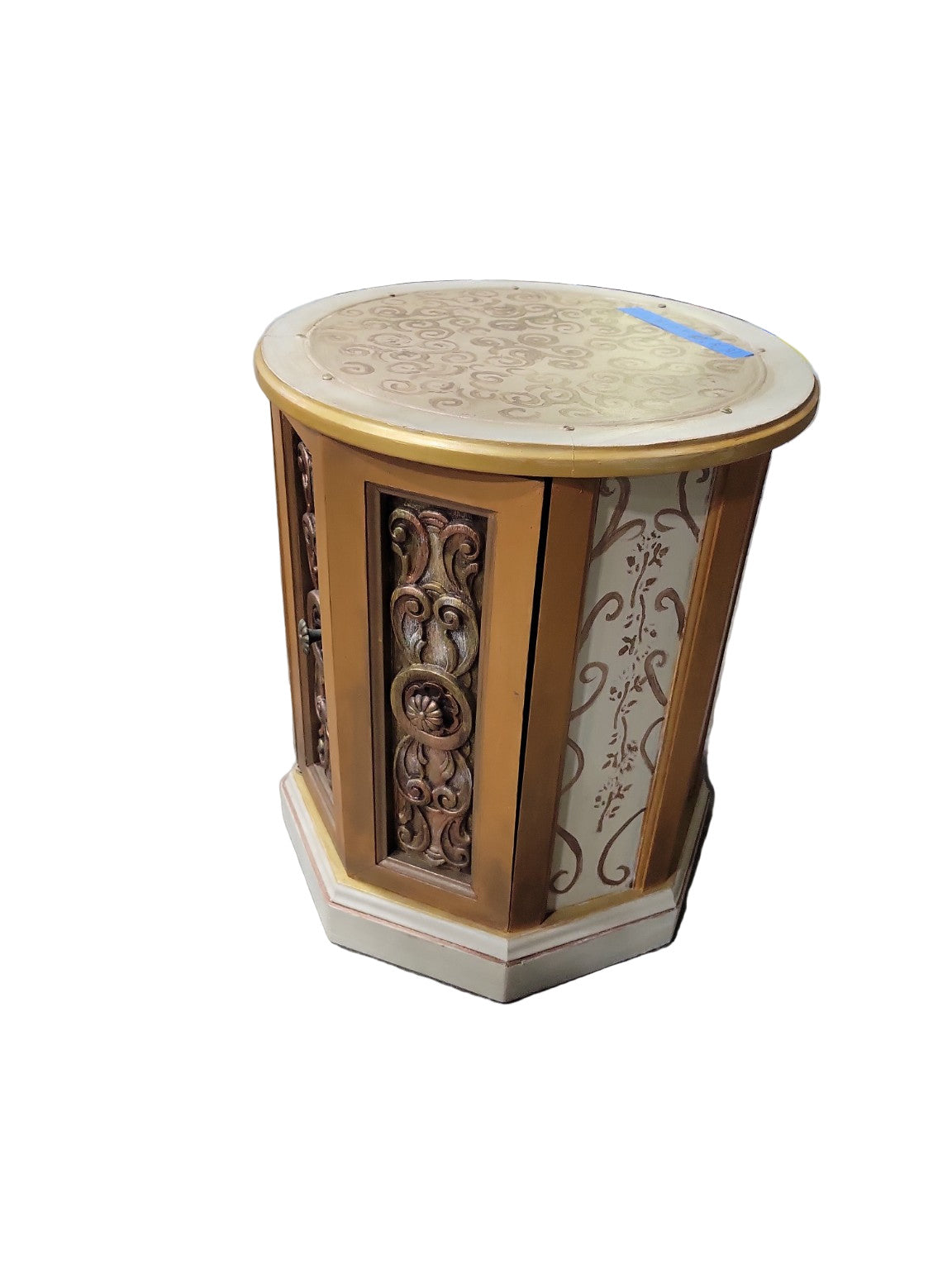 This hexagonal accent cabinet captures the warmth and ornate flair of mid-century Mediterranean Revival design. The piece features carved floral panels framed in golden oak tones, complemented by cream-colored scrollwork and a subtly embossed top. A single door opens to reveal a compact storage compartment, ideal for small living spaces or as a unique bedside table. Its blend of utility and decorative craftsmanship makes it a standout accent in bohemian, vintage, or eclectic interiors.