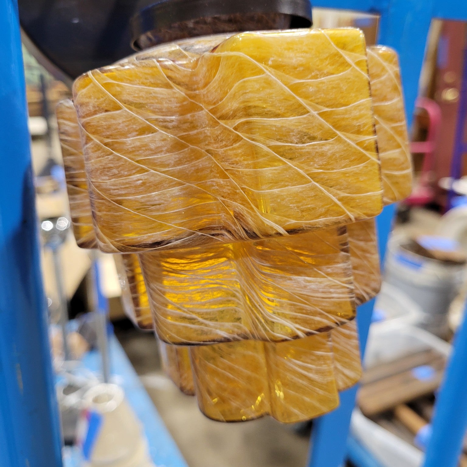 Glass molding and pressing tools, metalworking tools for the frame, and hand-finishing techniques for the swirl pattern.