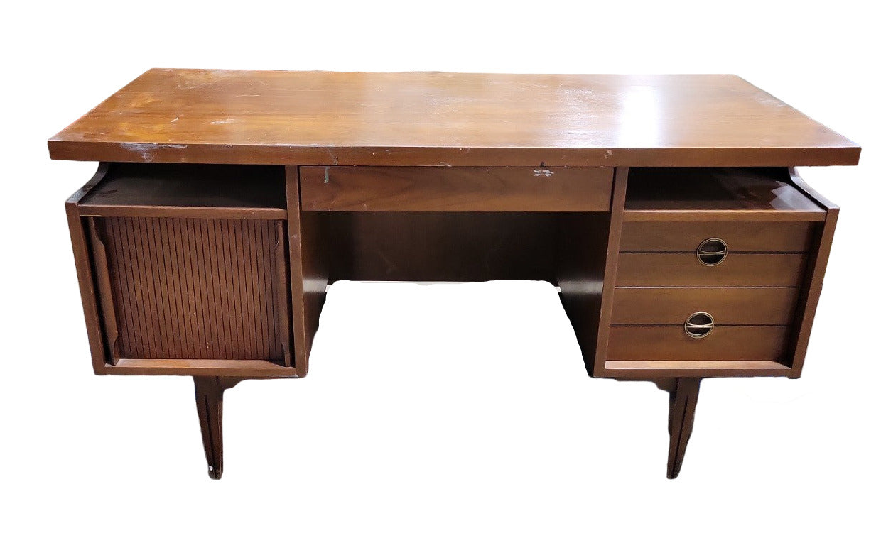 This iconic mid-century modern floating desk from the 1960s is part of the highly collectible “Mainline” collection by Hooker Furniture. Constructed of warm walnut with a streamlined silhouette, this desk features a floating top, tapered legs, and recessed brass hardware. The left pedestal includes a tambour-style sliding door with internal storage, while the right side offers three drawers with smooth action. Open cubbies above each pedestal add practical function. The back of the desk is fully finished with cane paneling, allowing it to float beautifully in a room. While the desktop shows minor surface scratches, the piece remains structurally sound and presents beautifully in its original condition. A standout piece of American modernism, ideal for collectors or stylish workspaces.