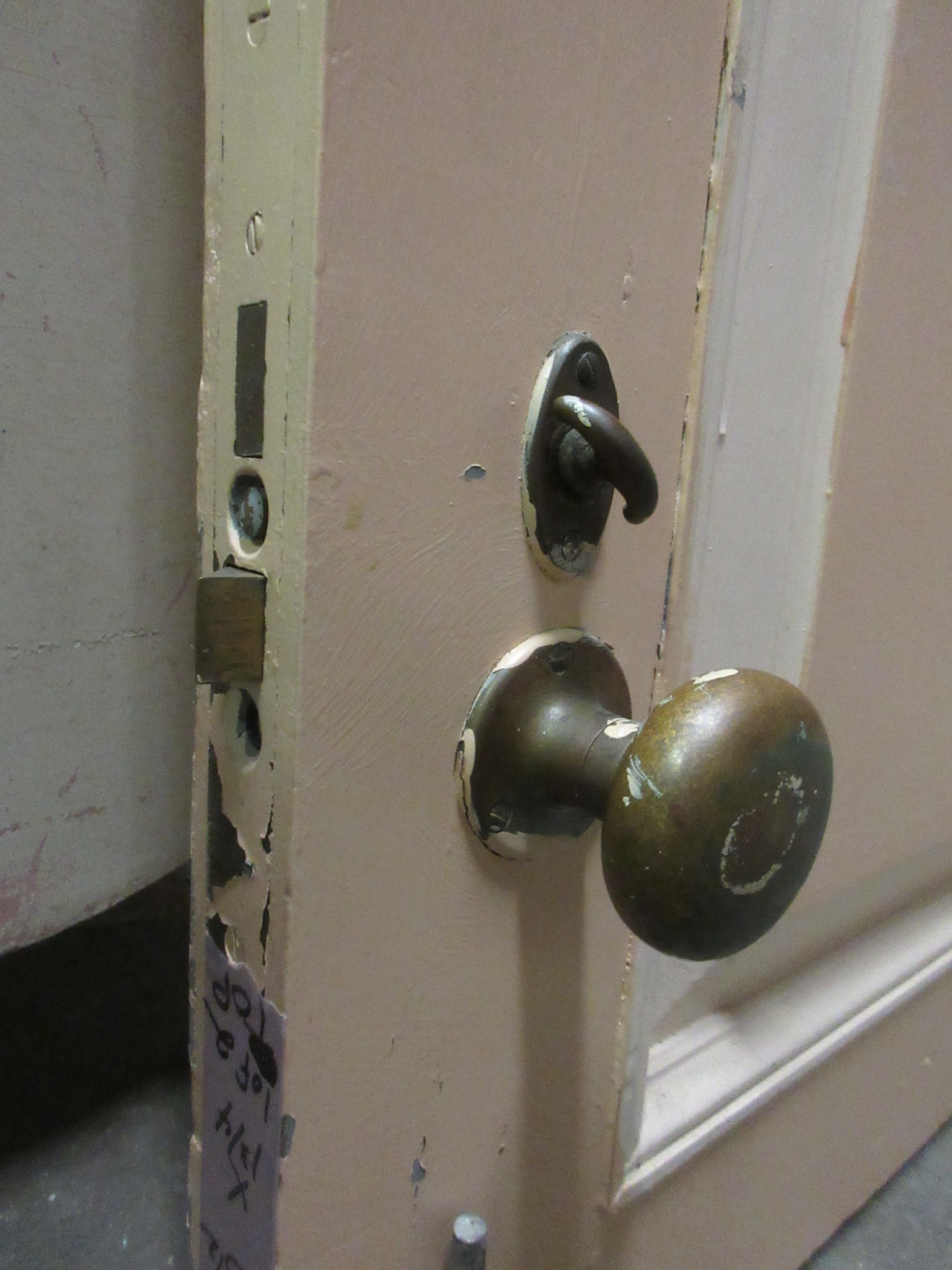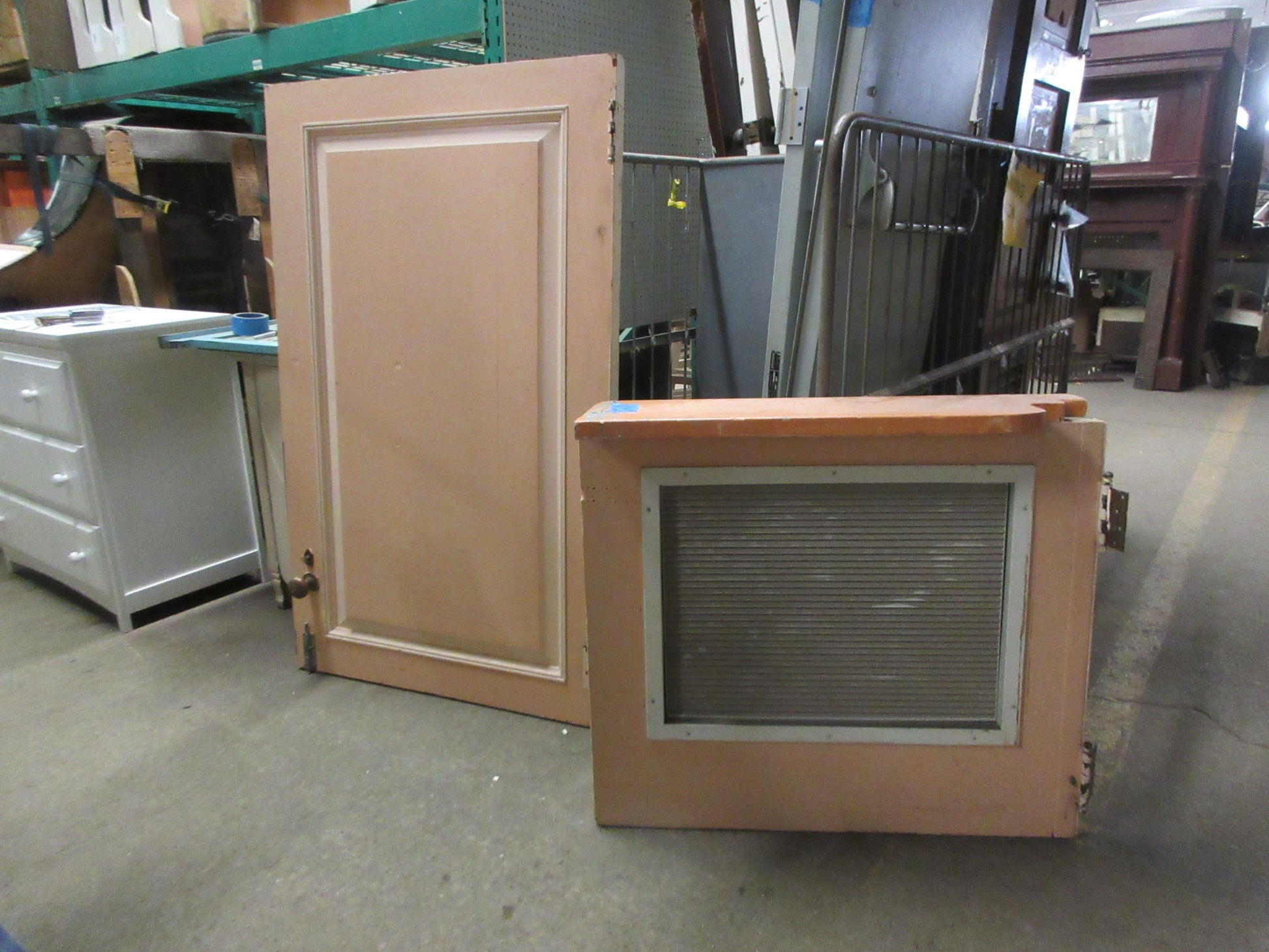 Description : Salvaged vintage Dutch door with vented bottom, single panel top. Door has 4" hinges and brass hardware.