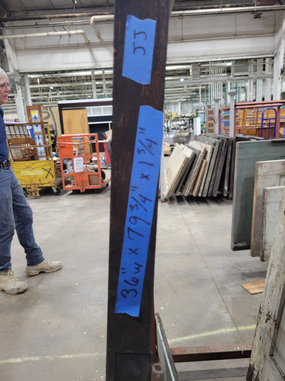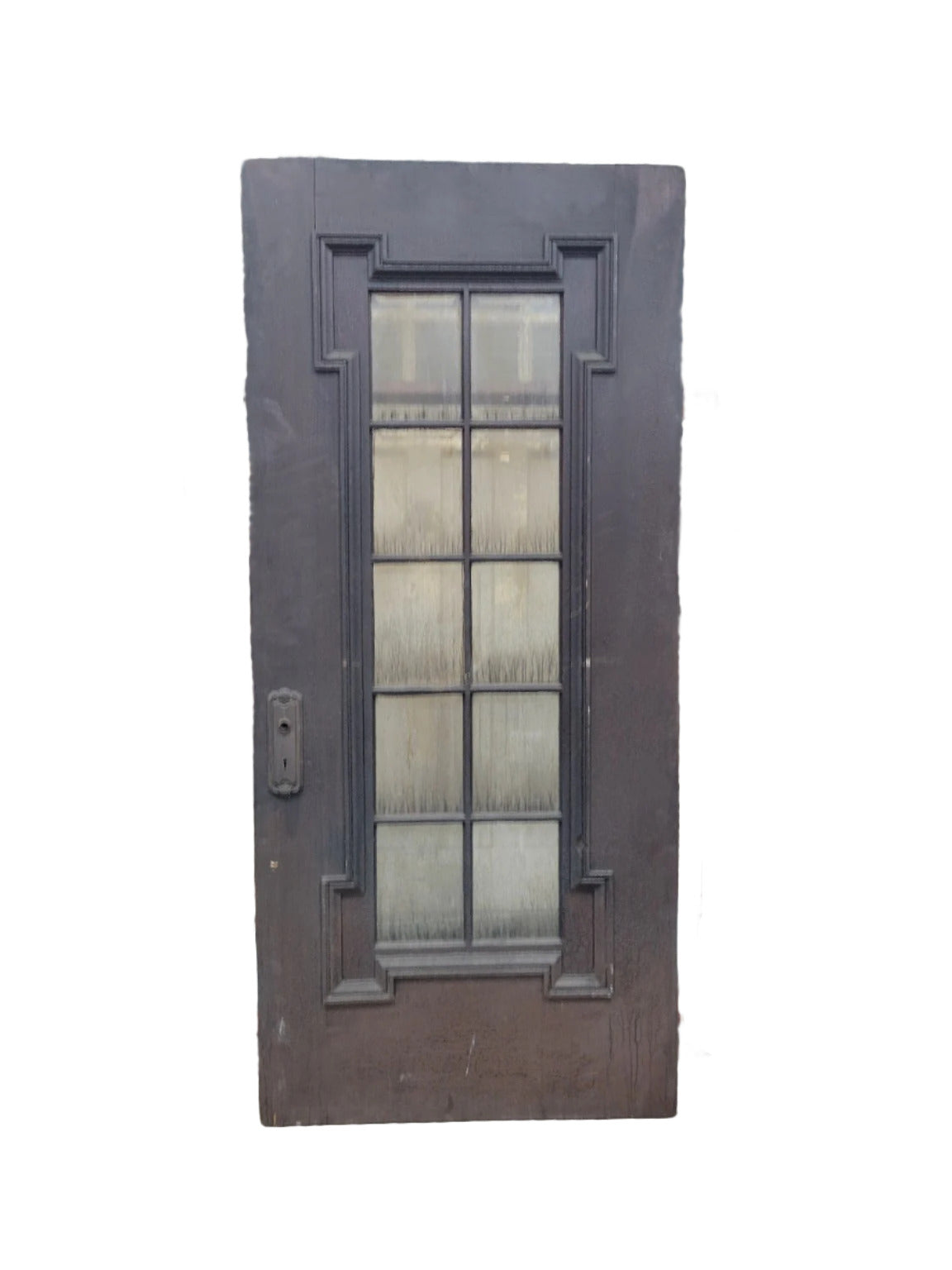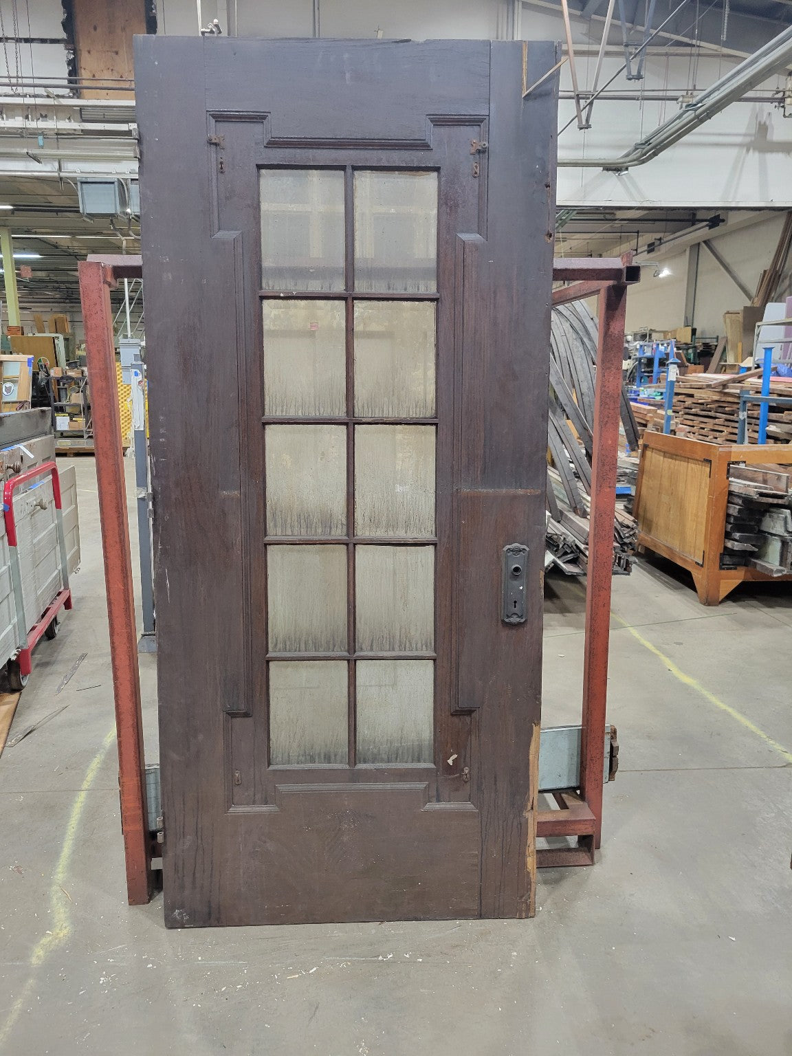 Description : This door is a unique architectural salvage piece featuring nine vertical glass lites set into a richly decorated wooden frame. The standout feature is the raised applied molding that adds dimension and period character to both the front and rear faces. The door retains its dark finish and old hardware, though some wear is present near the edges and lock mortise. The glass is aged but appears complete, and the profile makes this ideal for use as a front entry or styled interior statement piece.