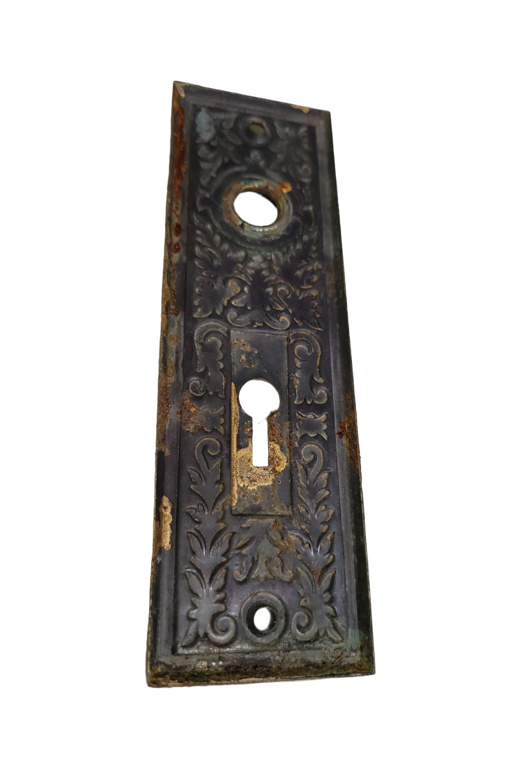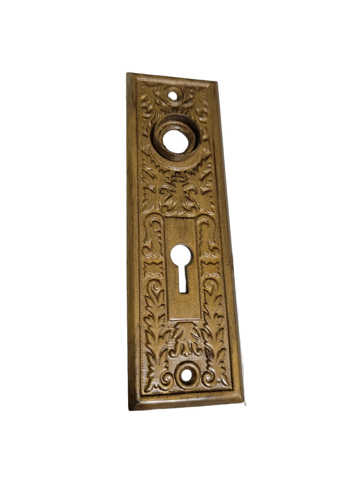 This antique backplate features raised acanthus leaf flourishes and symmetrical scrollwork in a compact rectangular form. With openings for both a standard knob spindle and skeleton keyhole, it is compatible with mortise locksets and ideal for architectural restoration or period-inspired projects. The detailing is deep and well-defined, making each piece both functional and decorative.