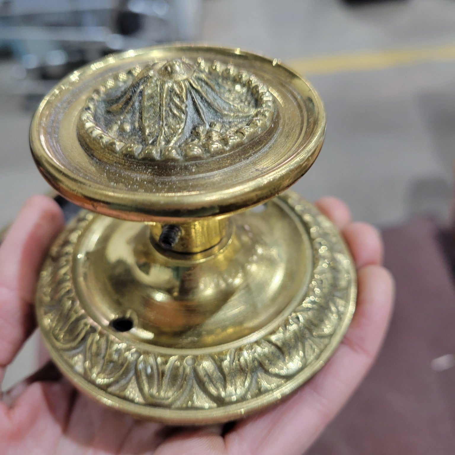 Description: A vintage brass door knob set featuring intricate floral and leaf designs on the knob face and escutcheon plate. This piece exhibits exquisite craftsmanship with raised detailing and a polished finish. The backplate measures approximately 3 1/8" in diameter. The set includes a locking mechanism and hardware stamped with "SARGENT," a renowned hardware manufacturer.