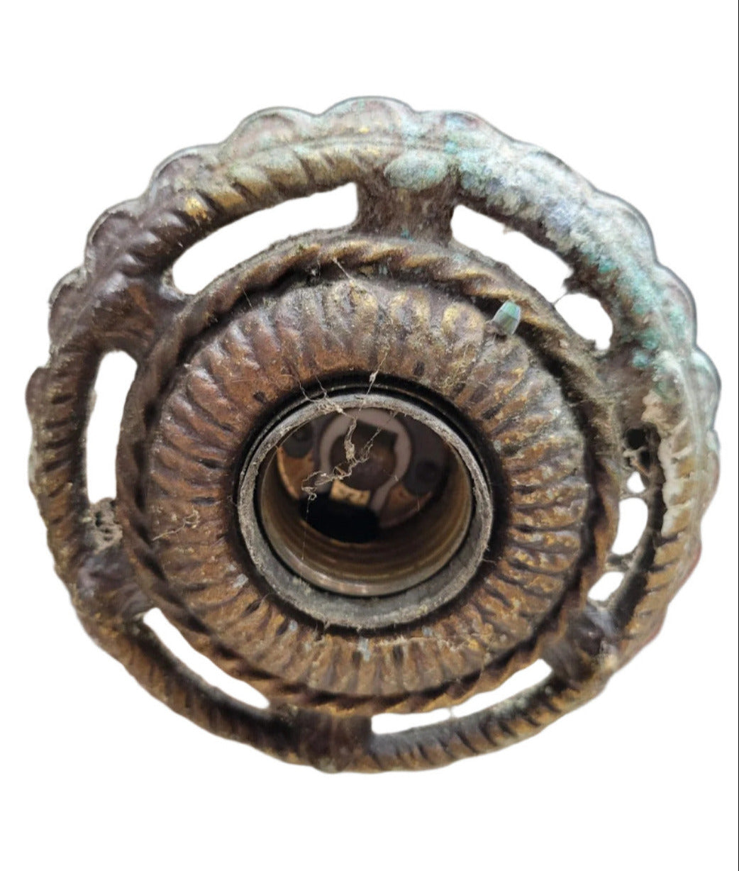 This elaborate cast iron chandelier features rich scrollwork and floral detailing, highlighted by five light arms with ornate bobeches and cast petal accents. Aged verdigris and rust patina enhance its antique appearance, while the open framework adds architectural interest. With its intricate craftsmanship, this piece is ideal for restoration or use in a period-style interior. Originally hardwired, the fixture currently requires rewiring to function.