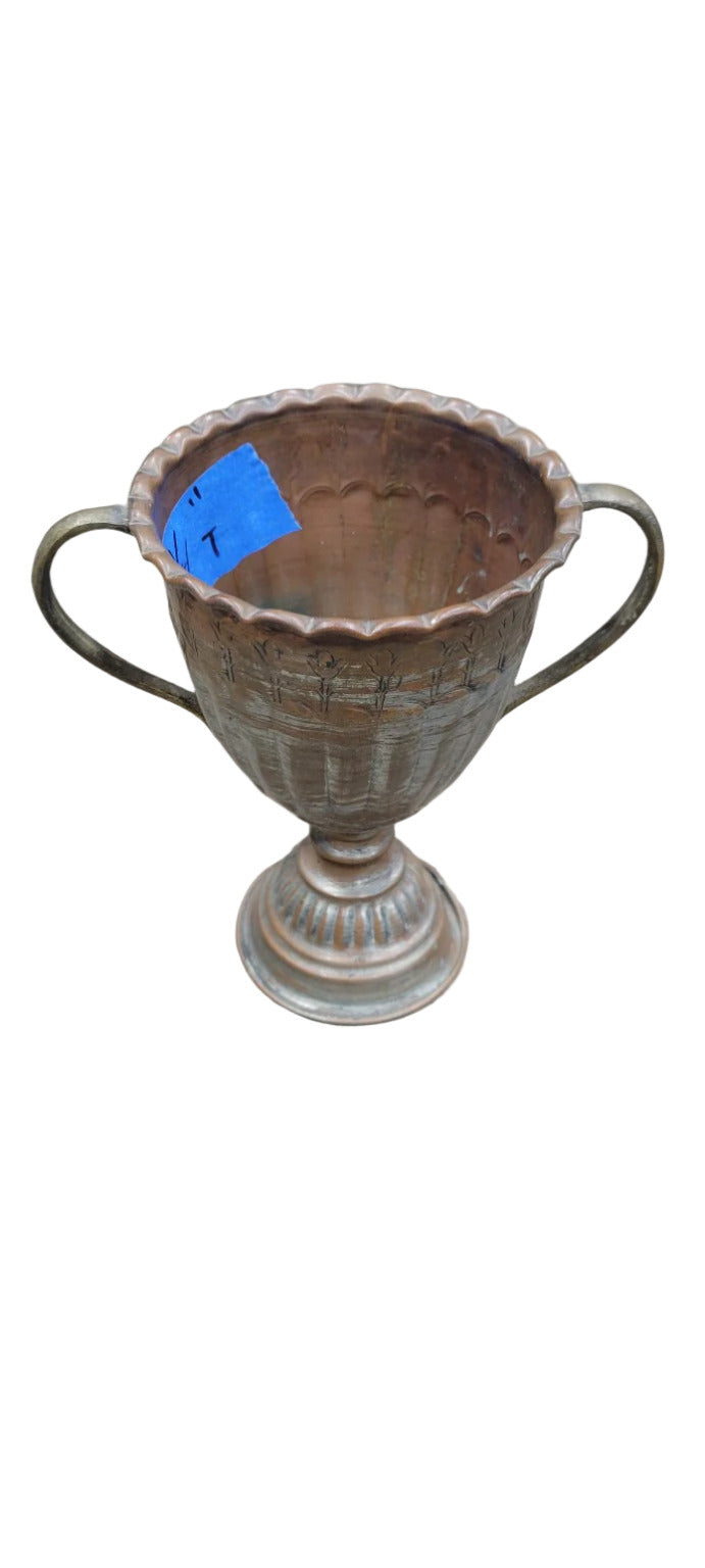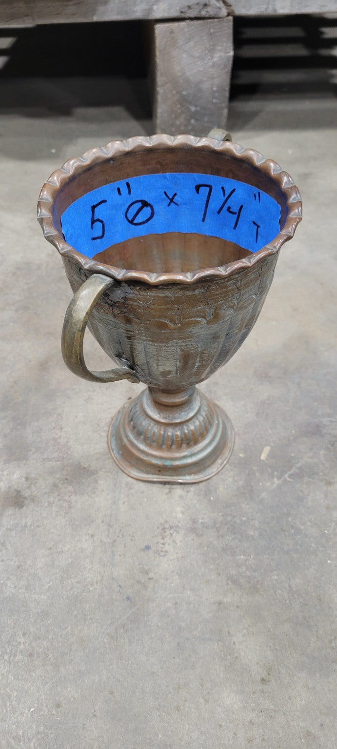 Decorative trophy-style urn made of patinated brass with fluted body, scalloped rim, and pedestal base. Features two loop handles and delicate floral etching along the upper section. A versatile piece for display or repurposed use.