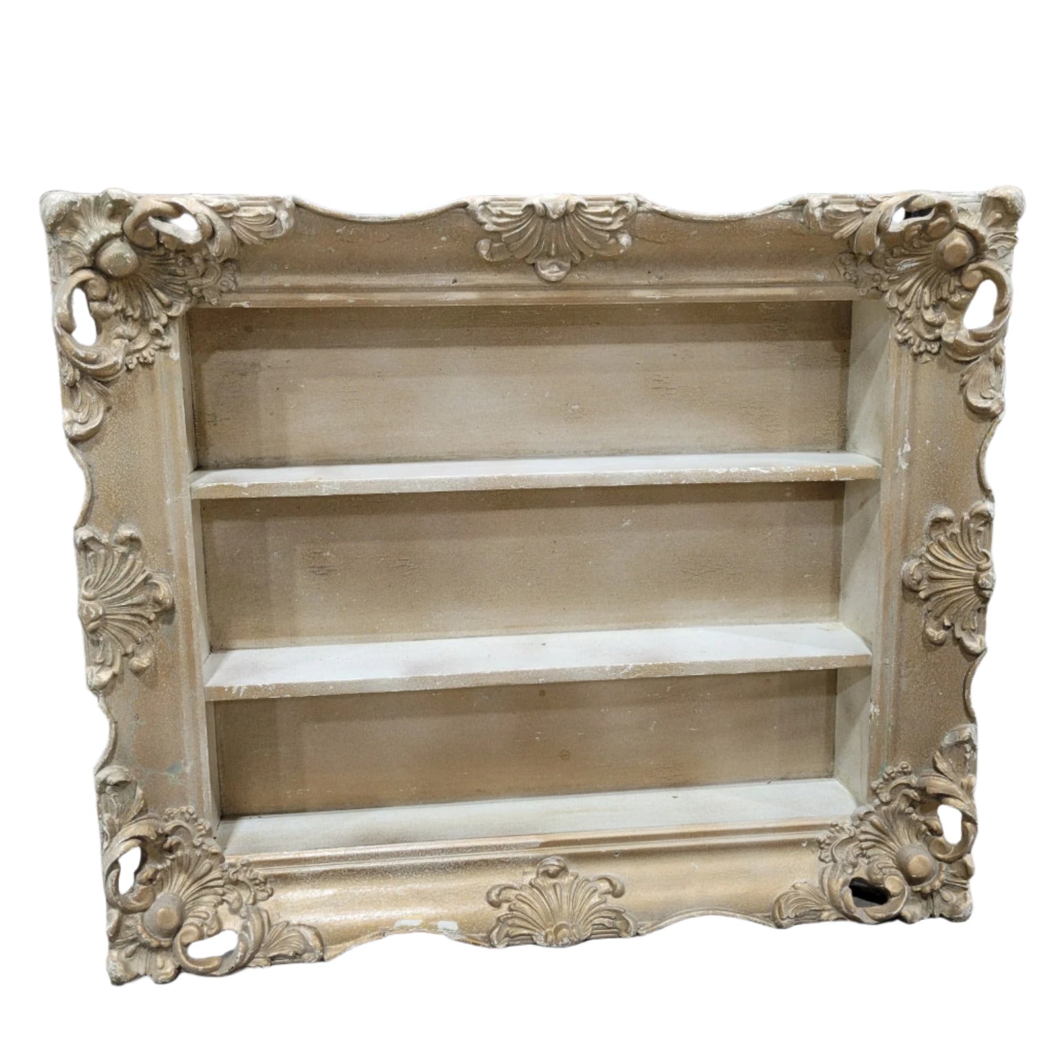 Description: A decorative wooden wall-mounted shelving unit featuring three interior shelves and a heavily detailed ornate frame with floral and shell motifs. The frame is finished in an aged, distressed beige or light gold tone.