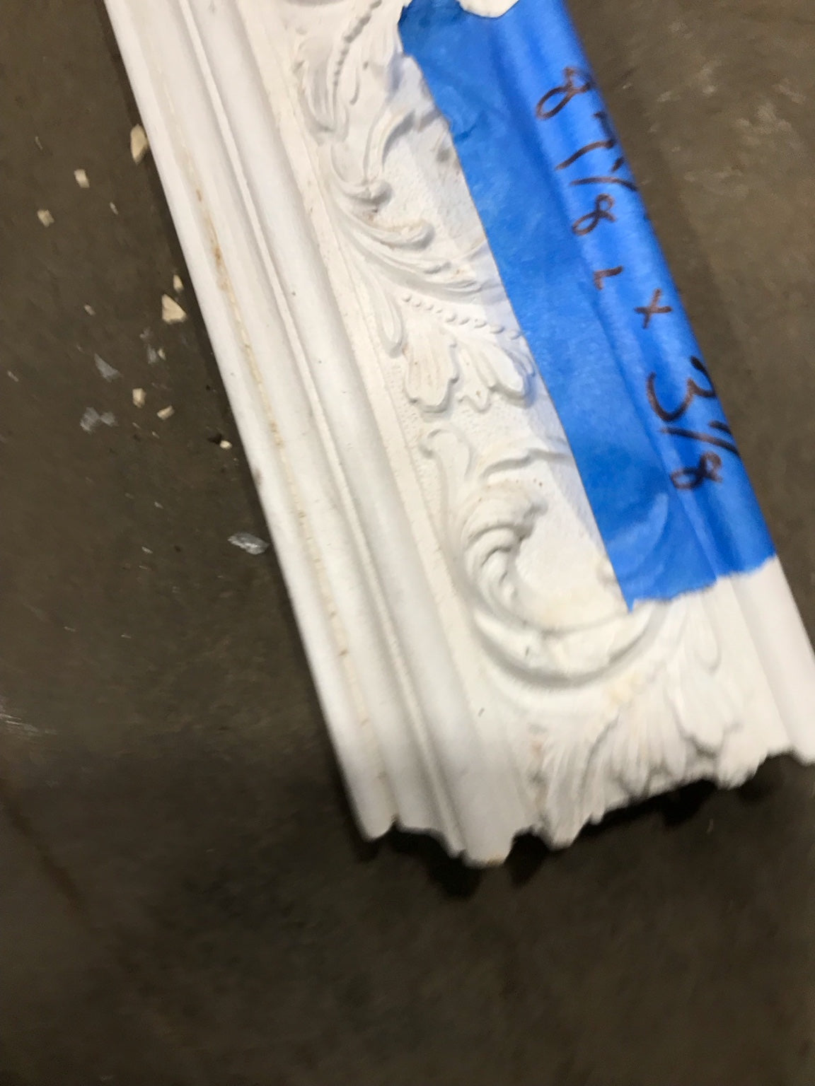 A decorative plaster crown moulding with intricate swirling vine and leaf patterns, measuring approximately 87 ⅛" long by 3 ⅝" wide. The design features a series of raised floral scrolls that add a refined touch to any interior space.