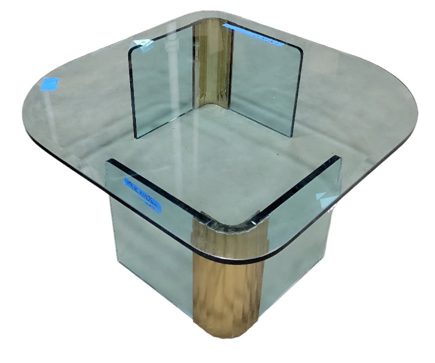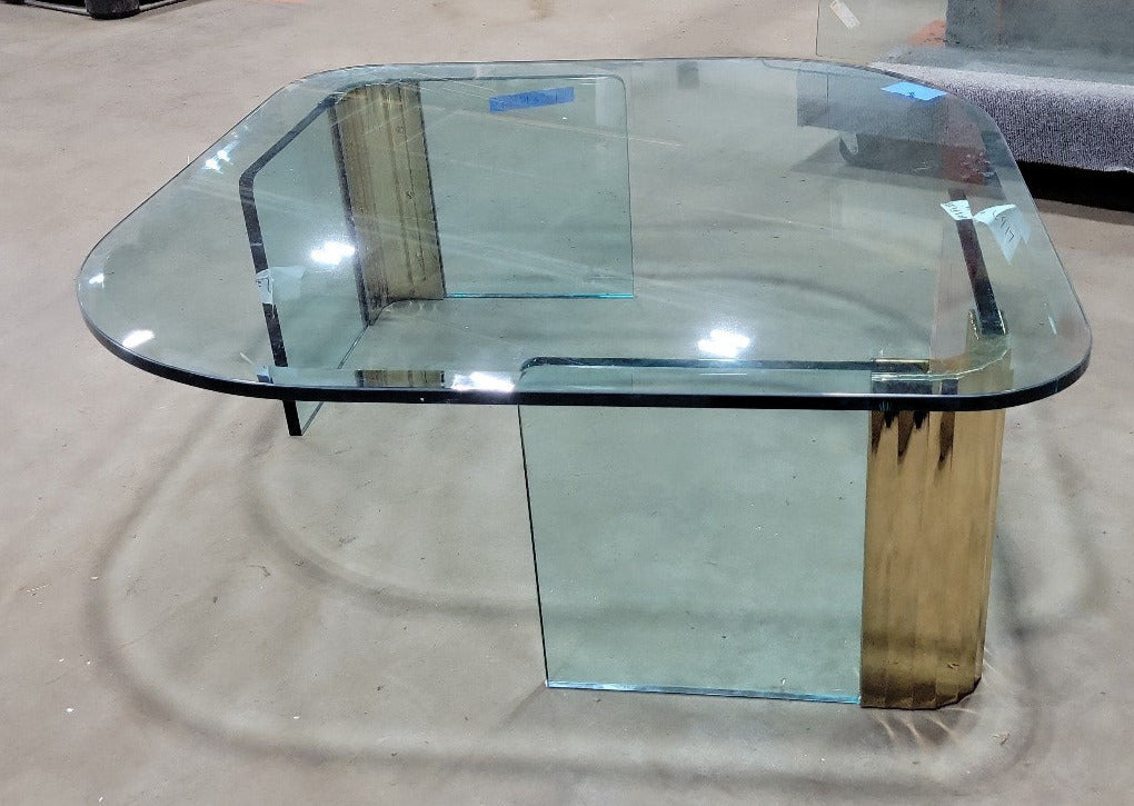 Description : Designed by Leon Rosen for the Pace Collection, this sculptural square coffee table is a hallmark of 1980s postmodern luxury. Featuring thick beveled glass on all surfaces, the table is anchored by a U-shaped base composed of clear panels and a distinctive ribbed brass-clad corner. The crisp geometry and contrast of transparent and metallic materials reflect the bold elegance and architectural influence that defined Rosen’s celebrated Pace designs. Though it shows light surface wear consistent with age, it remains a rare and iconic collector’s piece that exemplifies the glamour and craftsmanship of its era.