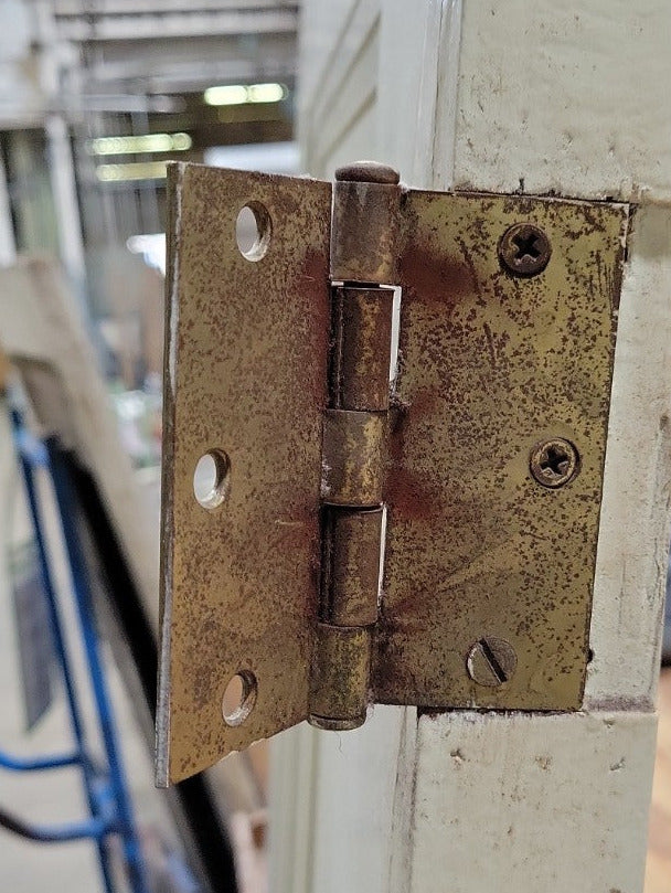This solid wood door features a classic recessed panel design with stepped molding, painted in a creamy off-white. A standout feature is the original faceted glass knob paired with a decorative aged-brass backplate, both showcasing elegant wear and patina. The door comes complete with its original brass hinges. Ideal for restoration projects or reuse in interior remodels, this door blends timeless form with period charm.