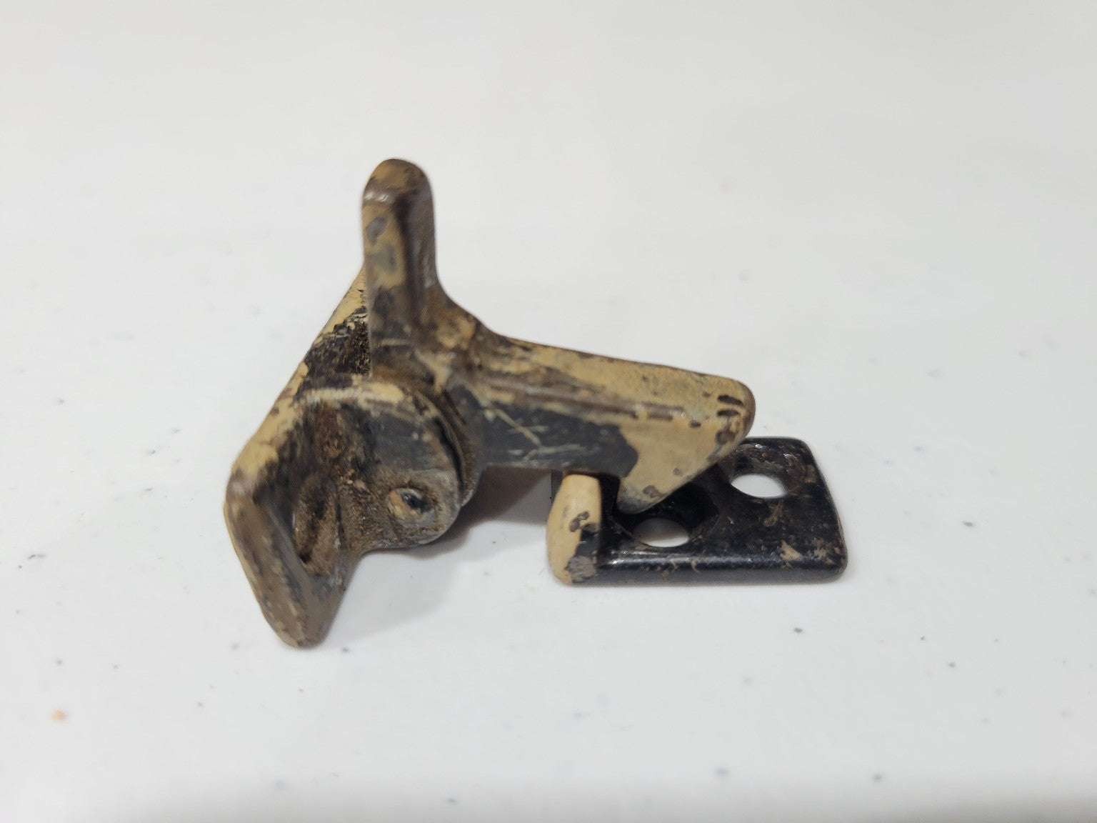 This set of two compact spring-loaded catches, each measuring 1¼" x 1¼", is crafted from cast iron and finished in black enamel with a worn, creamy top coat from previous use. These catches feature an upward-pointing tab lever designed to securely hold a cabinet door closed when the latch snaps into place. Originally used on mid-century and early 20th-century cabinetry, they provide a satisfying mechanical “click” and reliable closure.
