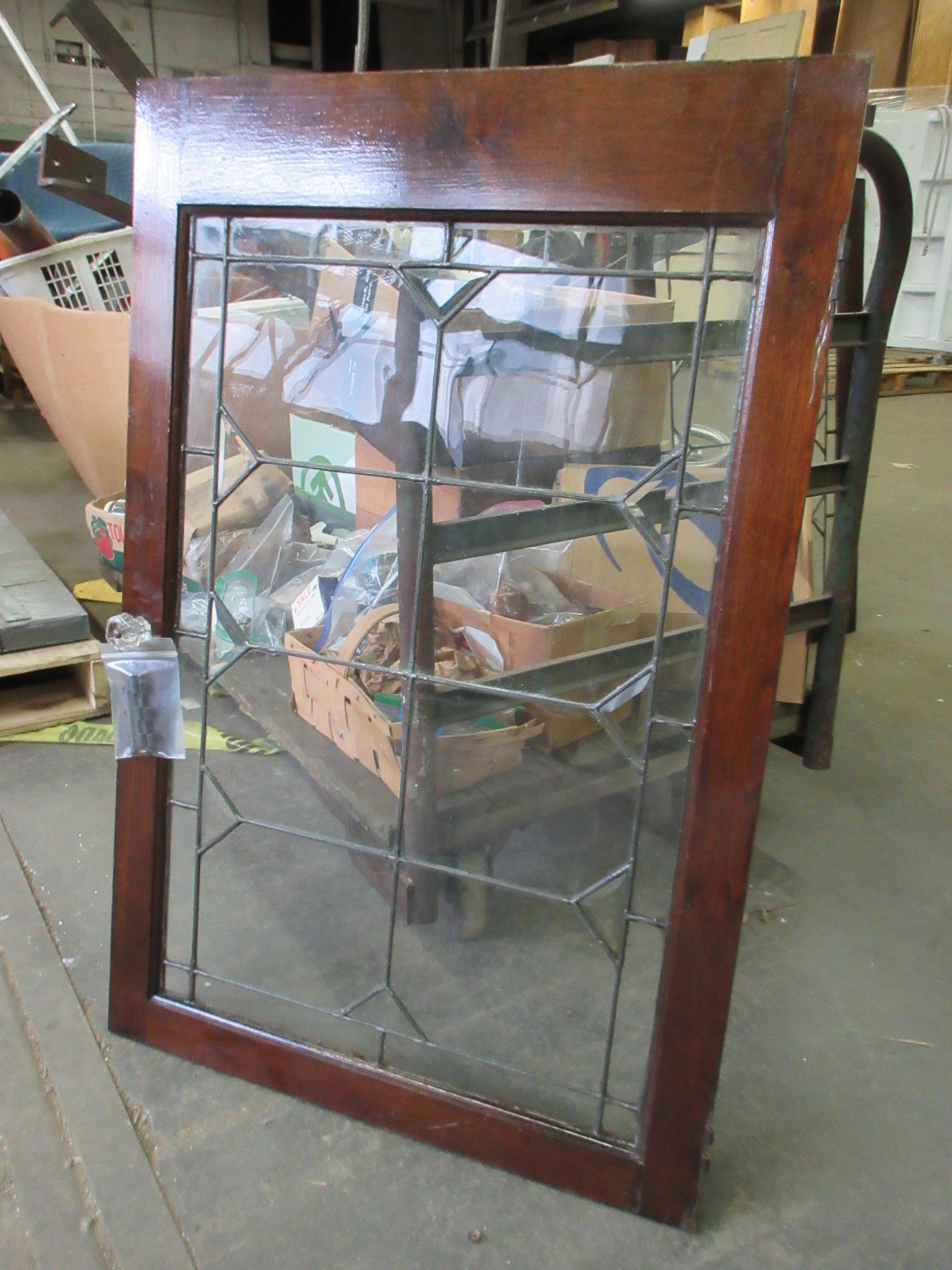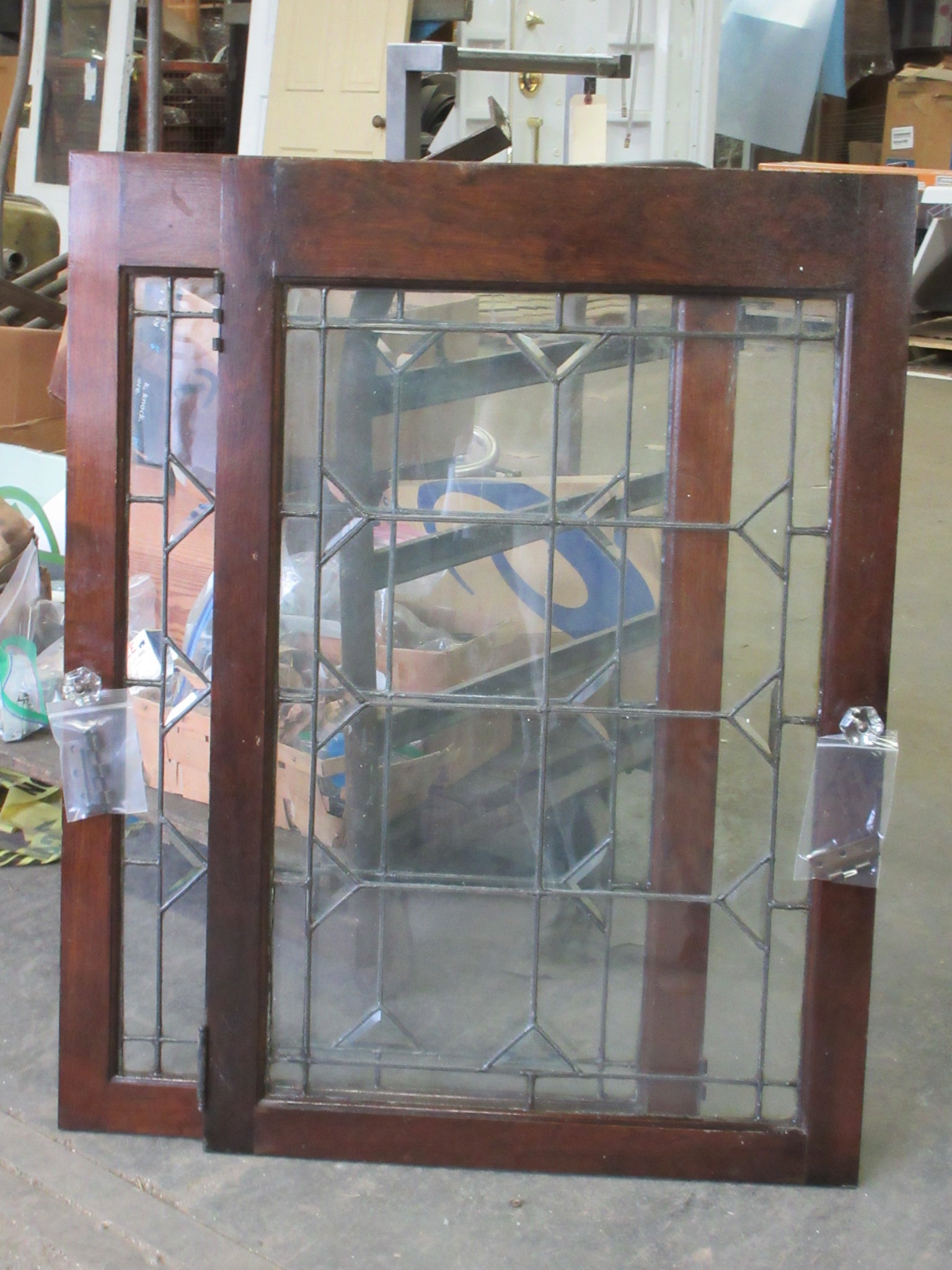 Description : Vintage wood frame leaded glass cabinet doors with glass pulls and hinges.