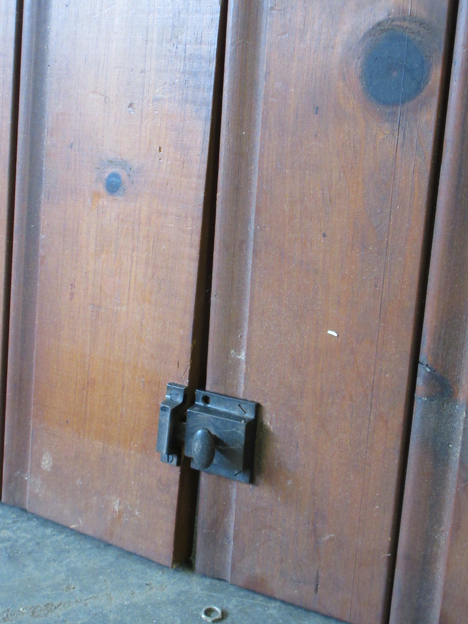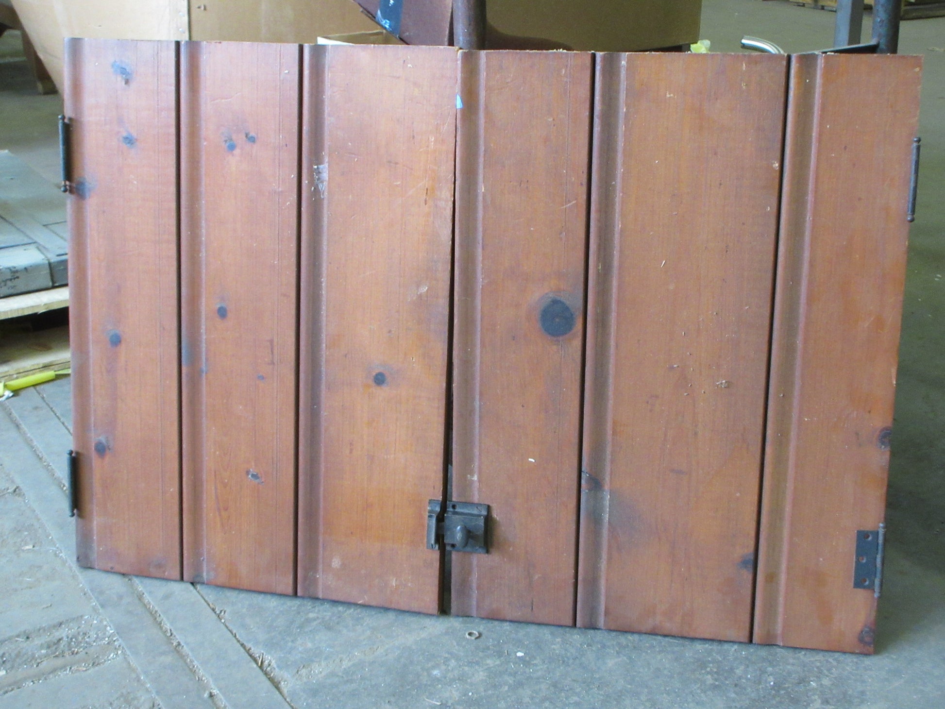 Description : Pair of vintage tongue and groove right hand latch cabinet doors with hinges.