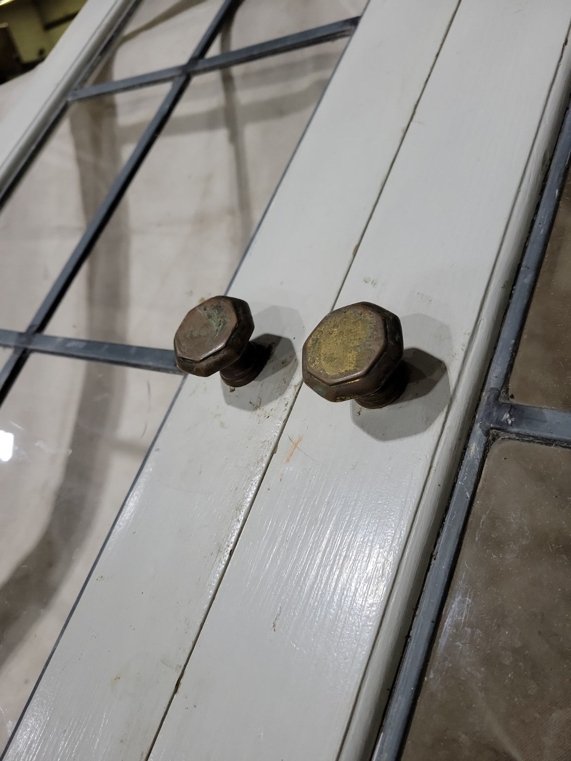 This charming set of two painted wood cabinet doors features true divided lite construction with clear glass panes and lead caming. Each door is fitted with aged brass hexagonal knobs and reveals subtle wear, adding character to their vintage appeal. Finished in soft white, these doors are ideal for a built-in cabinet, kitchen upper unit, or repurposed into a display or pantry piece. The pair retains their utility and beauty, ready for reuse in period-inspired or eclectic interiors.