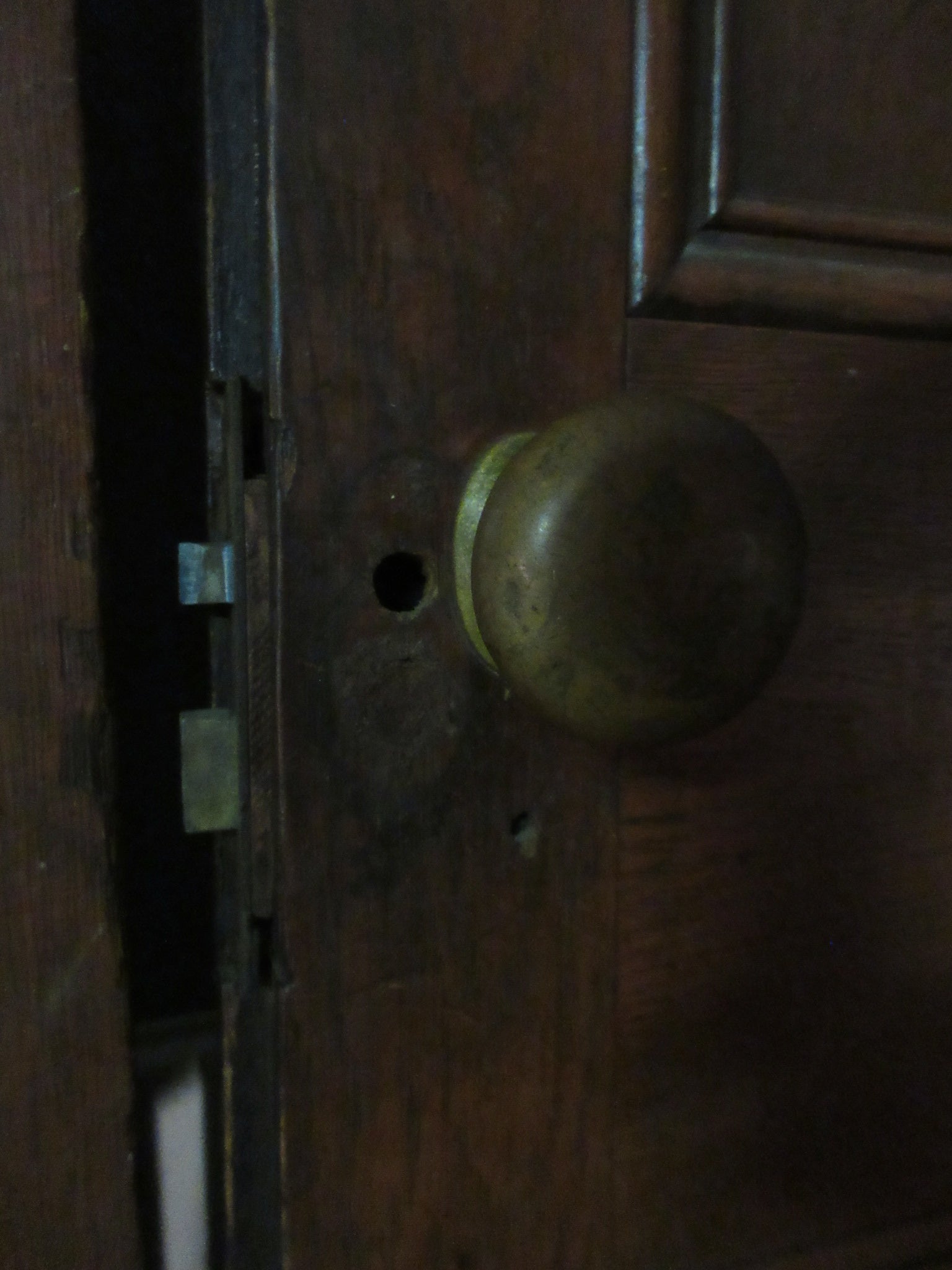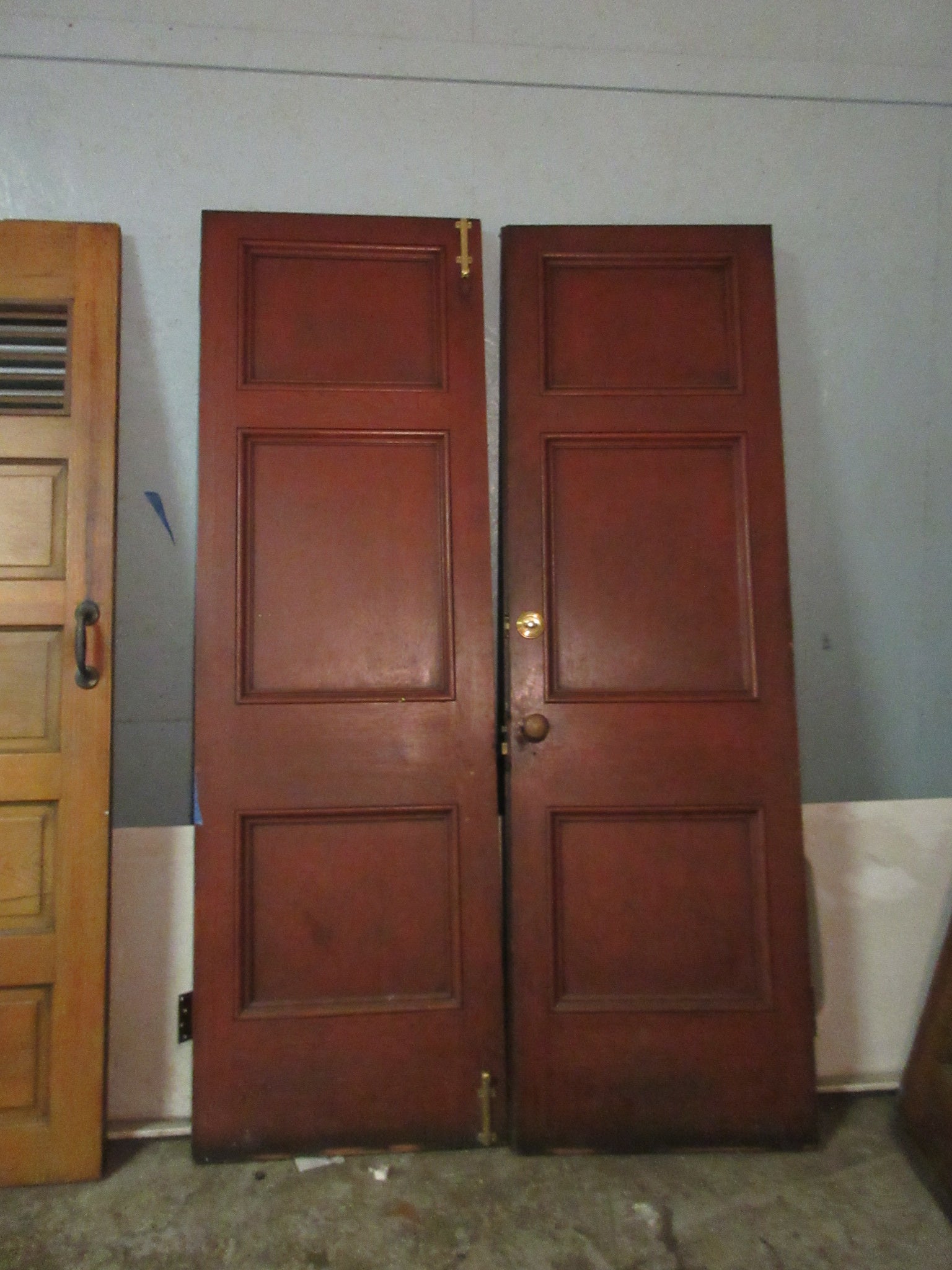 Description : Stained wood three panel French doors without glass lites. Each door measures as follows: 26 1/4"W 84"H x 1 3/4"D 25 3/4"W x 84"H x 1 3/4"D