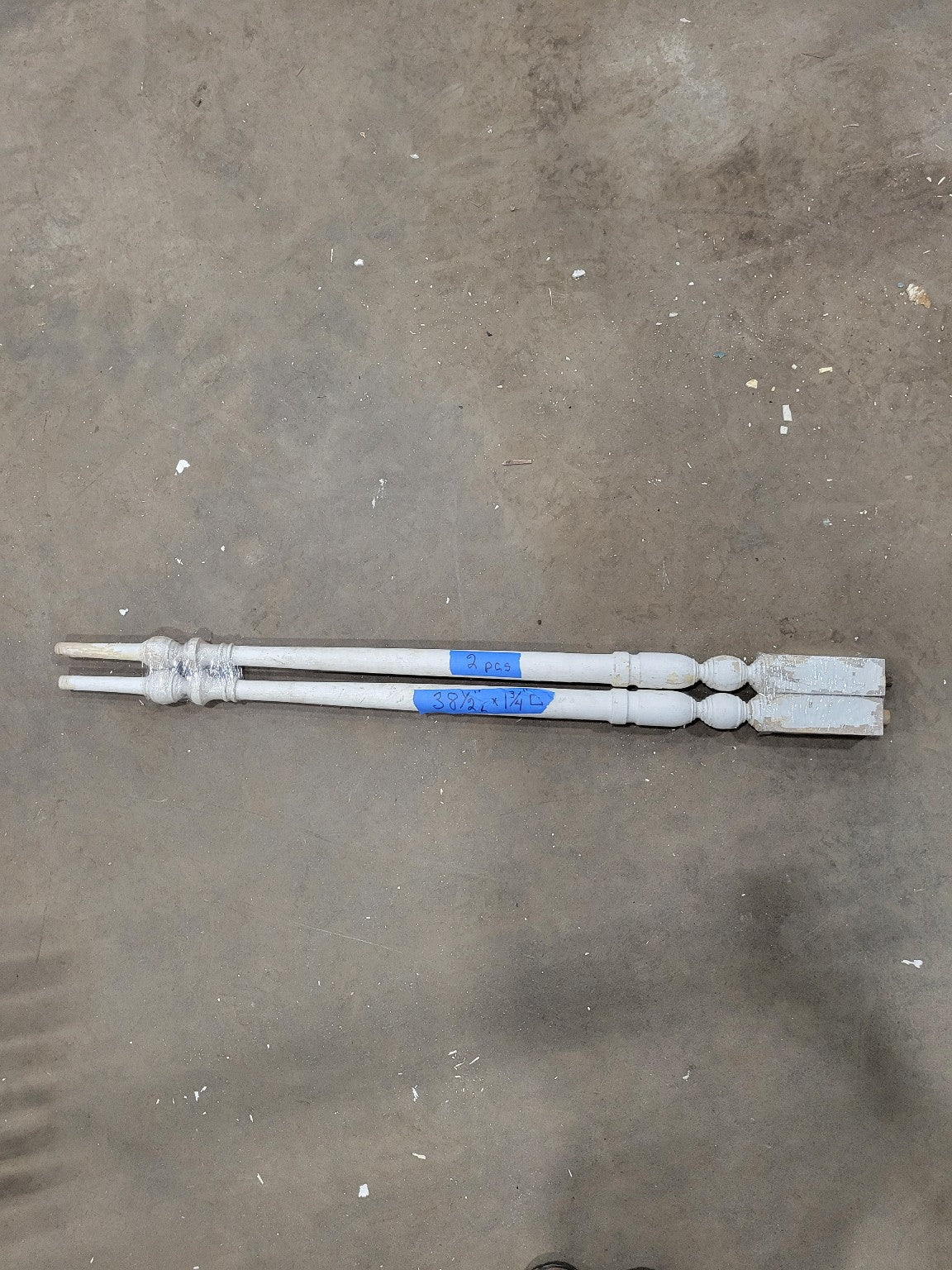 Description : This set includes 2 salvaged vintage stair balusters, beautifully turned with a square-top design. Each piece measures approximately 38 ½" in length with a 1 ¾" square end. Featuring a distressed white painted finish, these balusters are ideal for stair restoration projects, custom furniture designs, or rustic home décor. Their naturally aged look and fine craftsmanship make them excellent choices for both repair and creative repurposing.