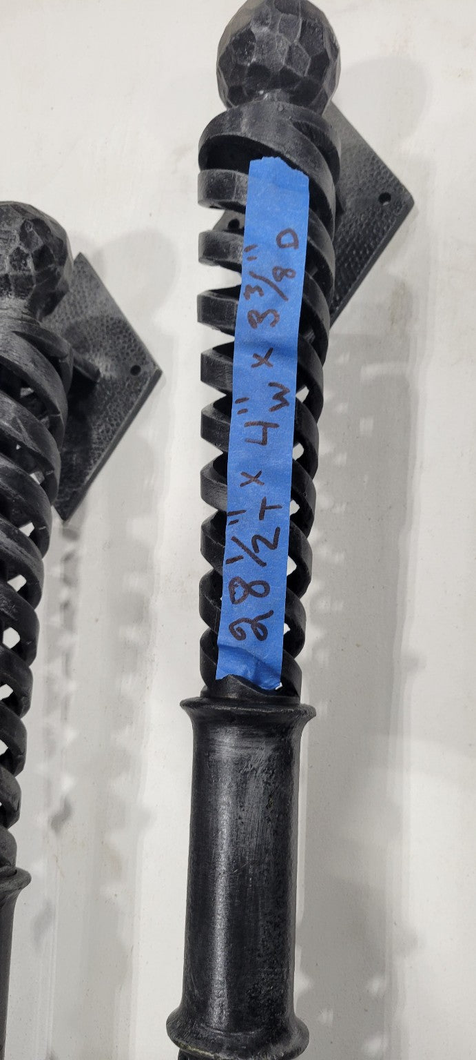 These large, heavy-duty wrought iron door pull handles feature a twisted design with decorative hammered ends. Each handle is attached to a diamond-shaped backplate with pre-drilled holes for secure mounting. The black iron finish adds a rustic and industrial appeal.