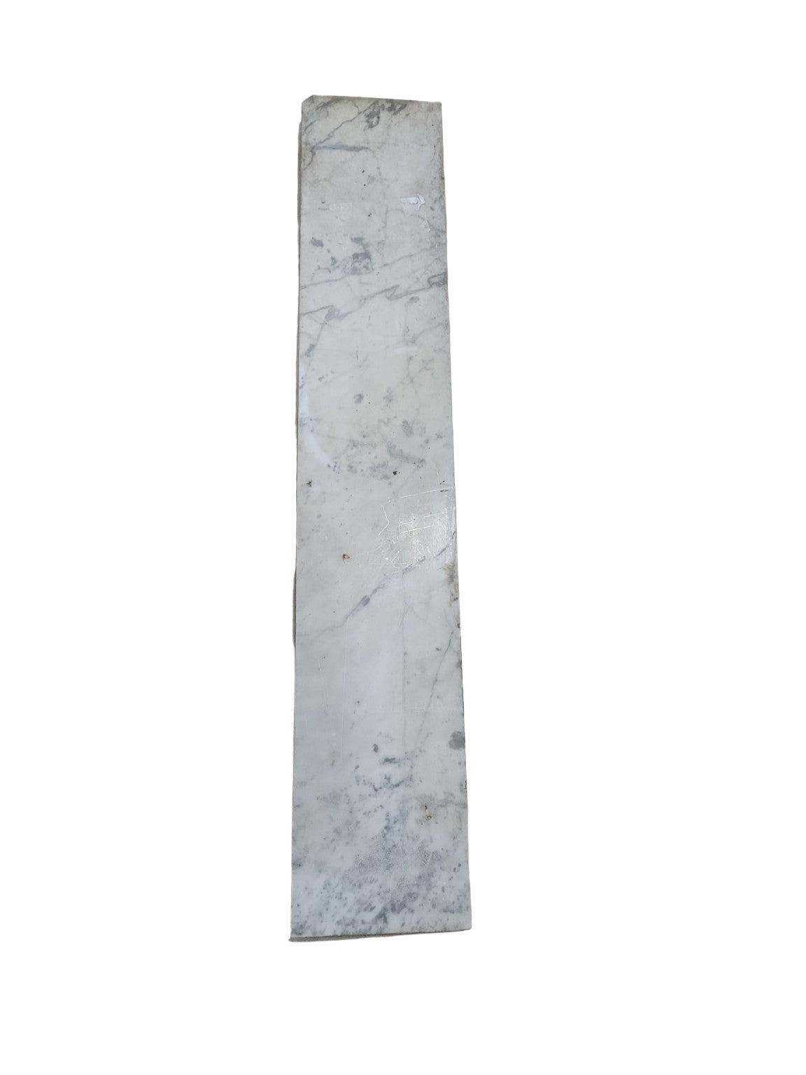 This long and narrow Carrara marble piece features a subtle mix of soft gray veining across a creamy white base, presenting a clean, modern look with gentle character. Measuring 33" long by 6" wide and 1 1⁄4" thick, it is ideal for a backsplash, a wall-mounted shelf, or a fireplace accent. The finish is polished on one face, while the raw, unrefined back and a naturally chipped corner lend an aged, architectural salvage vibe.