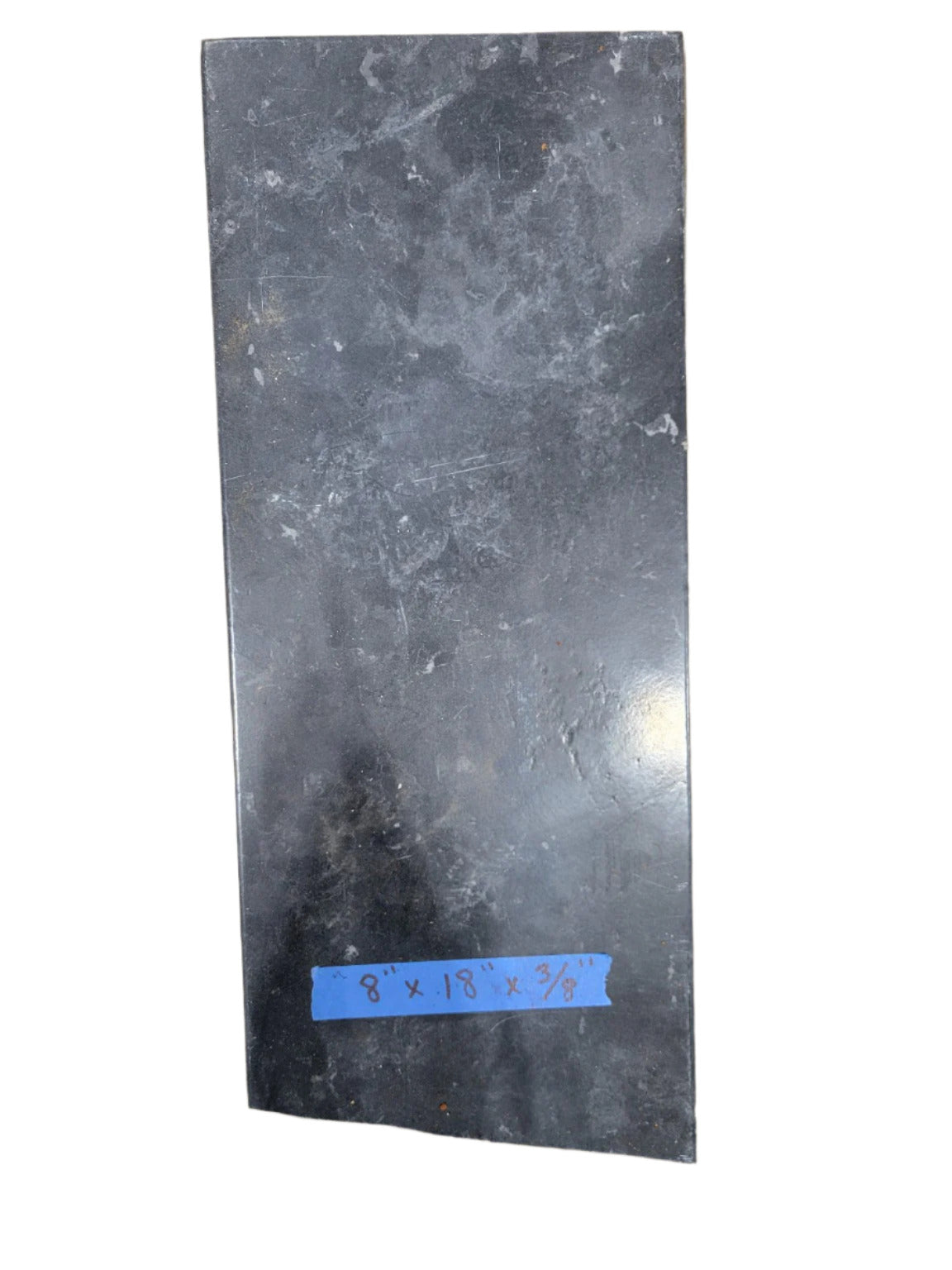 A single rectangular cutoff piece of polished black tile with subtle veining and soft edge wear. Dimensions are clearly marked: 8" x 18" x ⅜". Ideal for repurposing as a small shelf, plant stand top, or accent insert in furniture or tilework.