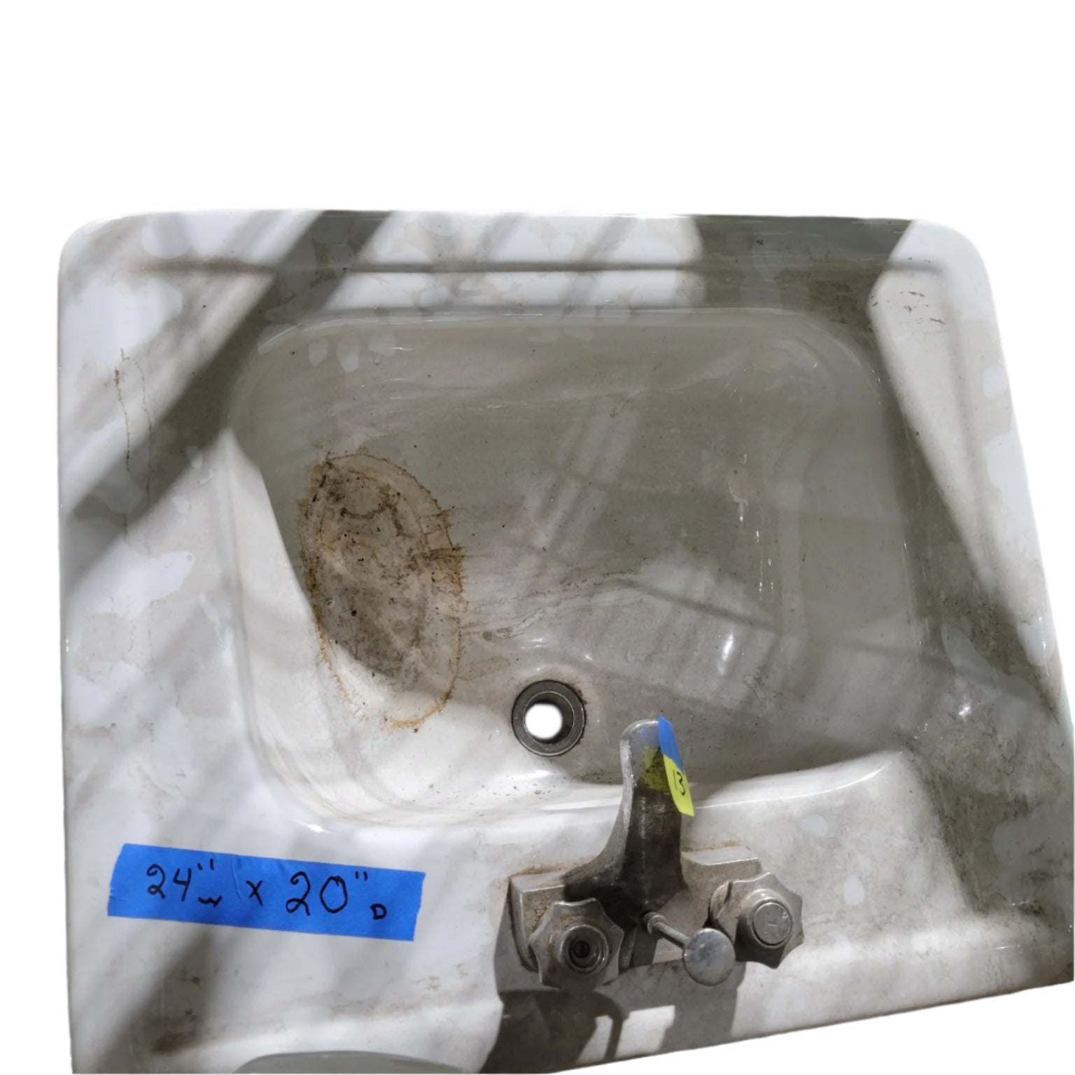 A vintage porcelain corner sink with a built-in faucet and single drain hole. The sink shows visible signs of use, including rust and staining.