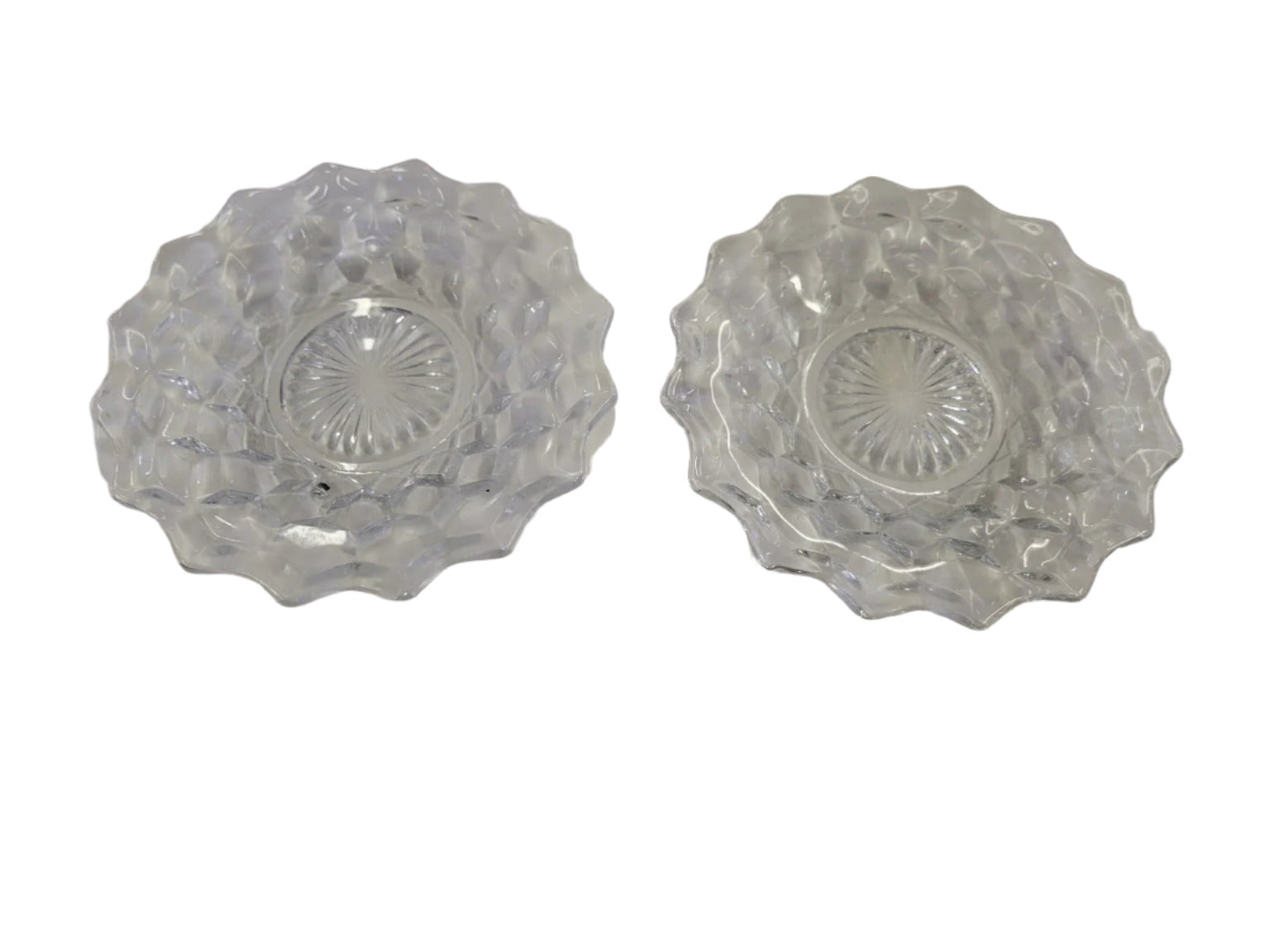 This pair of vintage pressed glass dishes features a crisp honeycomb-style pattern along the rim and a sunburst motif in the center. Each dish measures 6 inches wide and has a gently scalloped edge, adding elegance and light-catching detail. Perfect for serving snacks, candies, or as base plates for candles or vases. Both dishes are free from chips and retain excellent clarity, showcasing the timeless craftsmanship of mid-century molded glassware.