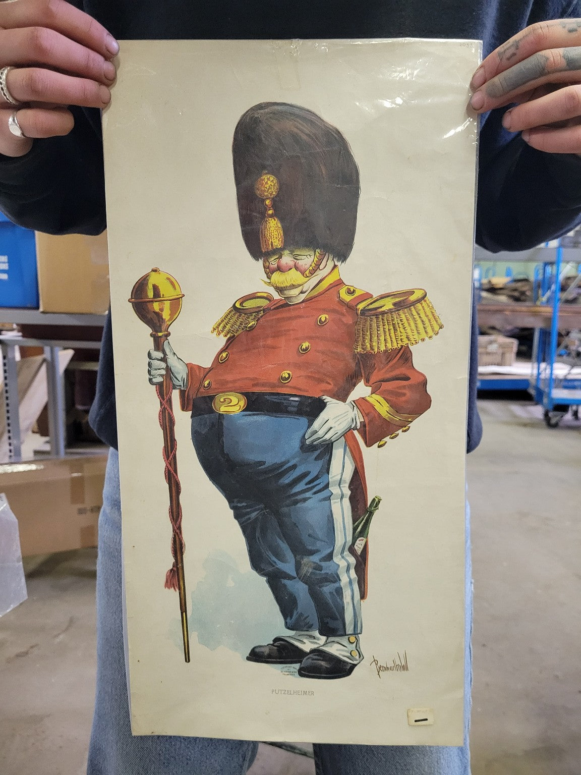 This humorous vintage lithograph by Bernhardt Wall, titled “Putzelheimer,” features a plump, pompous military figure in full parade regalia. Dressed in a bright red jacket with ornate epaulettes, tall bearskin hat, and polished baton, the officer leans proudly forward—his comically exaggerated belly stretching his uniform. A bottle peeking from his pocket adds a layer of satire, suggesting indulgence or mock authority. The image is rich with bold lines, saturated color, and character-driven storytelling. Despite visible wear including creases and tape residue, the artwork's presence remains intact. A collectible print for lovers of vintage satire, military caricatures, or early 20th-century lithography.