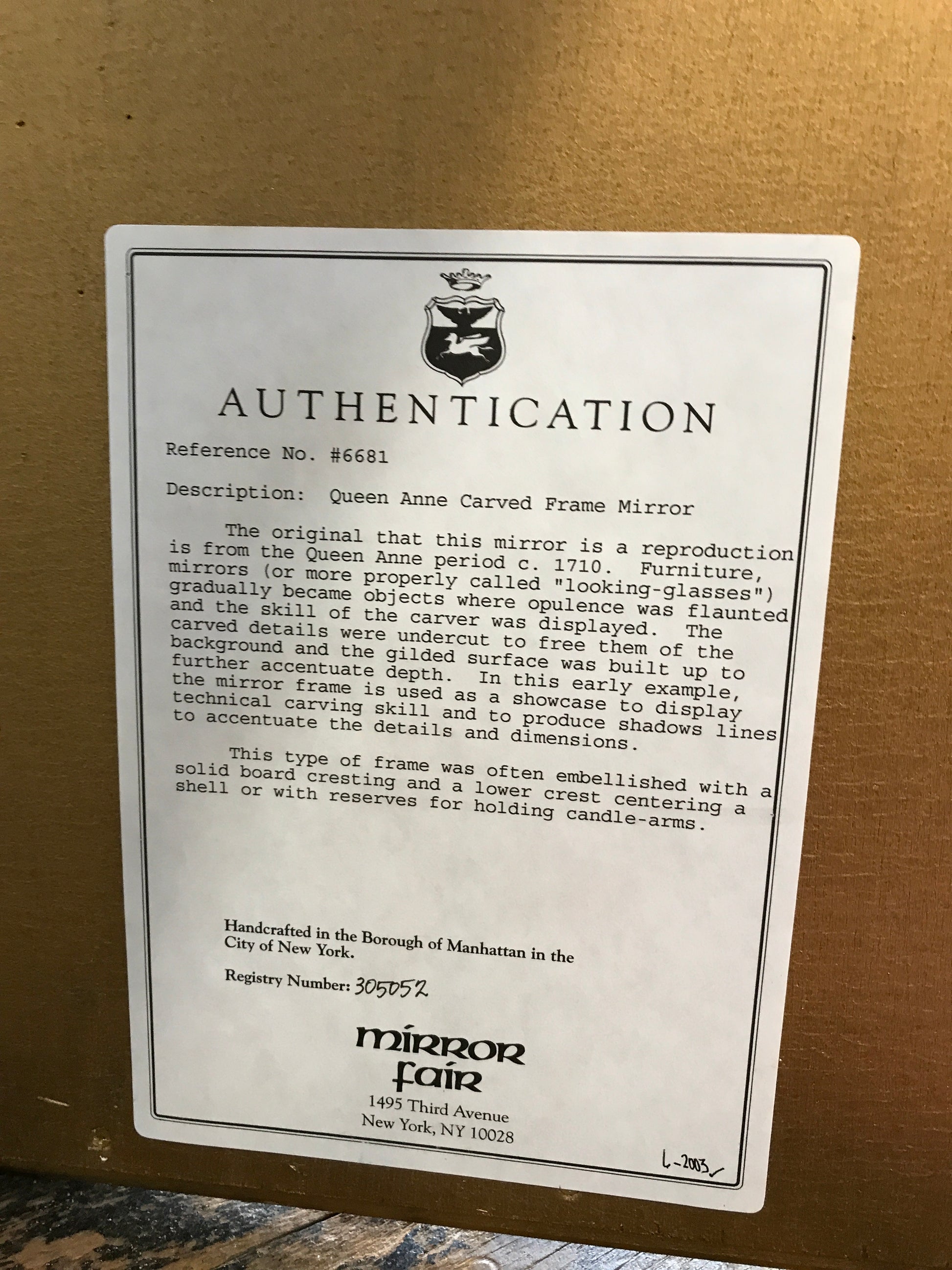 Description : The original mirror that this mirror is a reproduction is from the Queen Anne period c. 1710. Technical carving Handcrafted in the Borough of Manhattan in the City of New York. Authentic Mirror Fair.